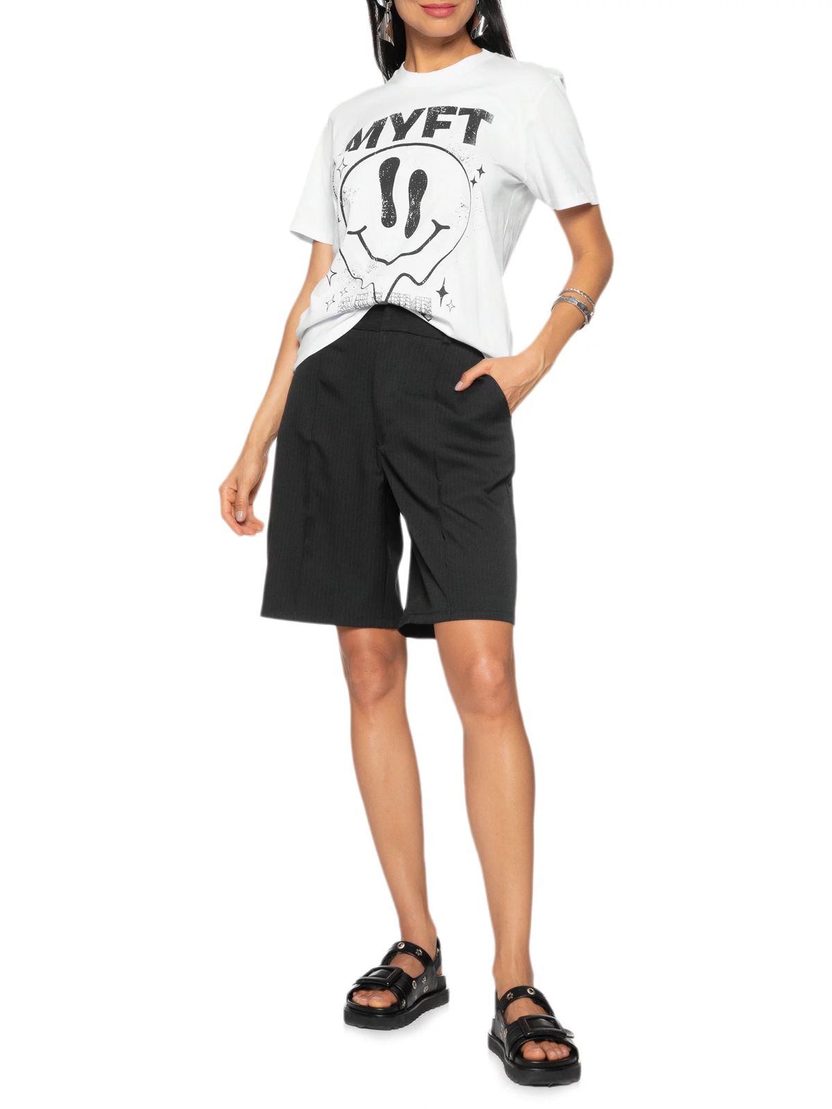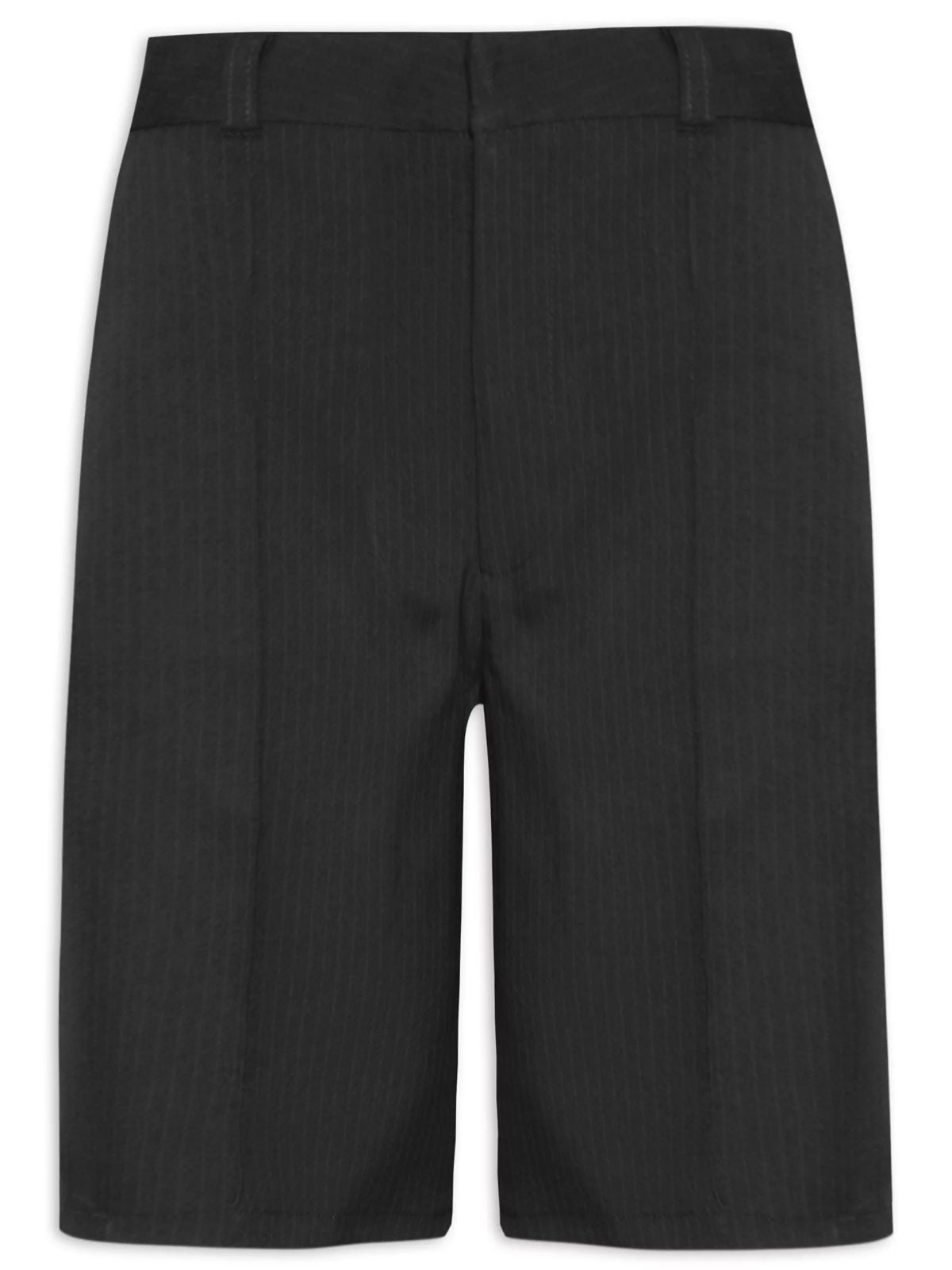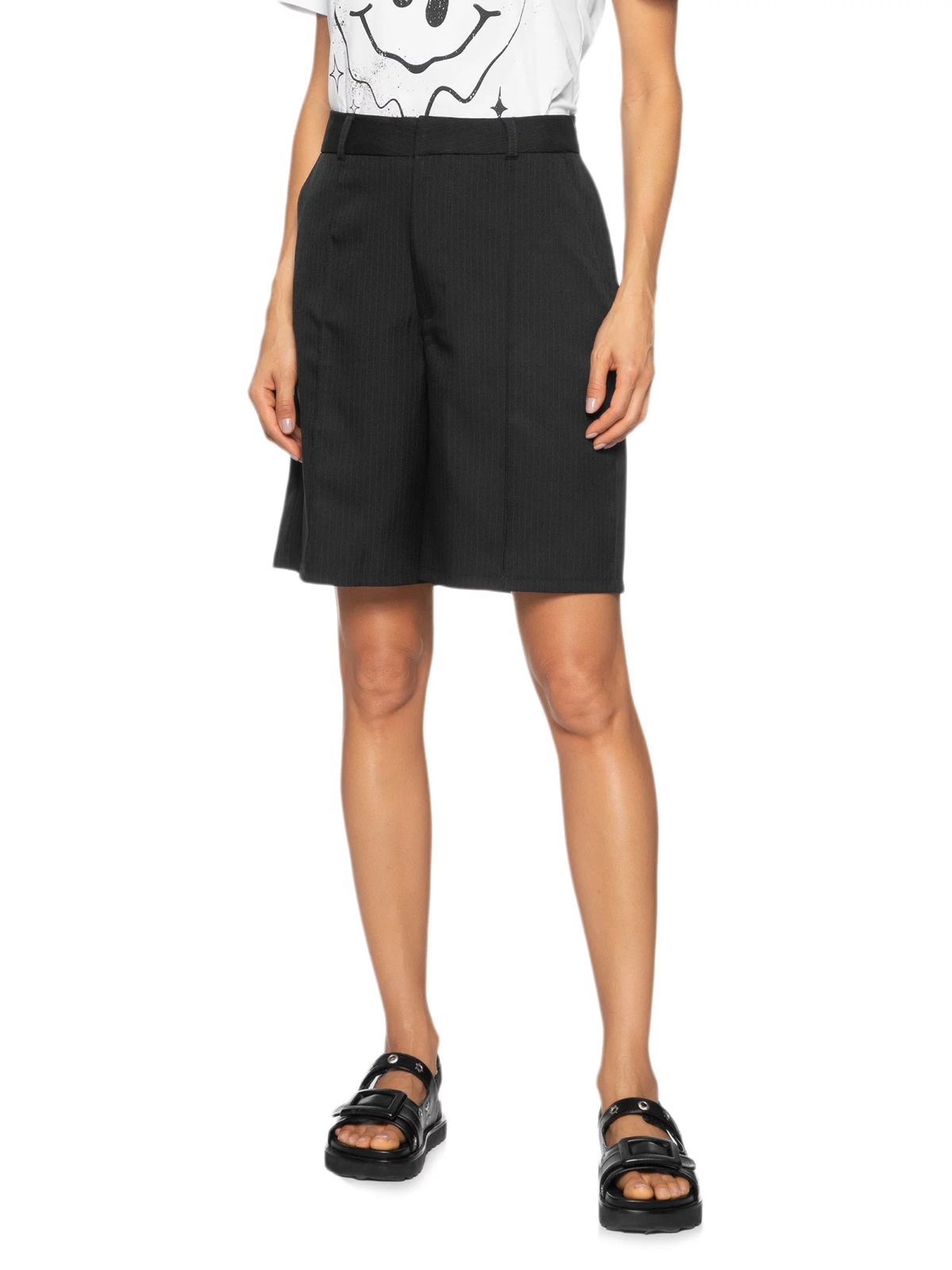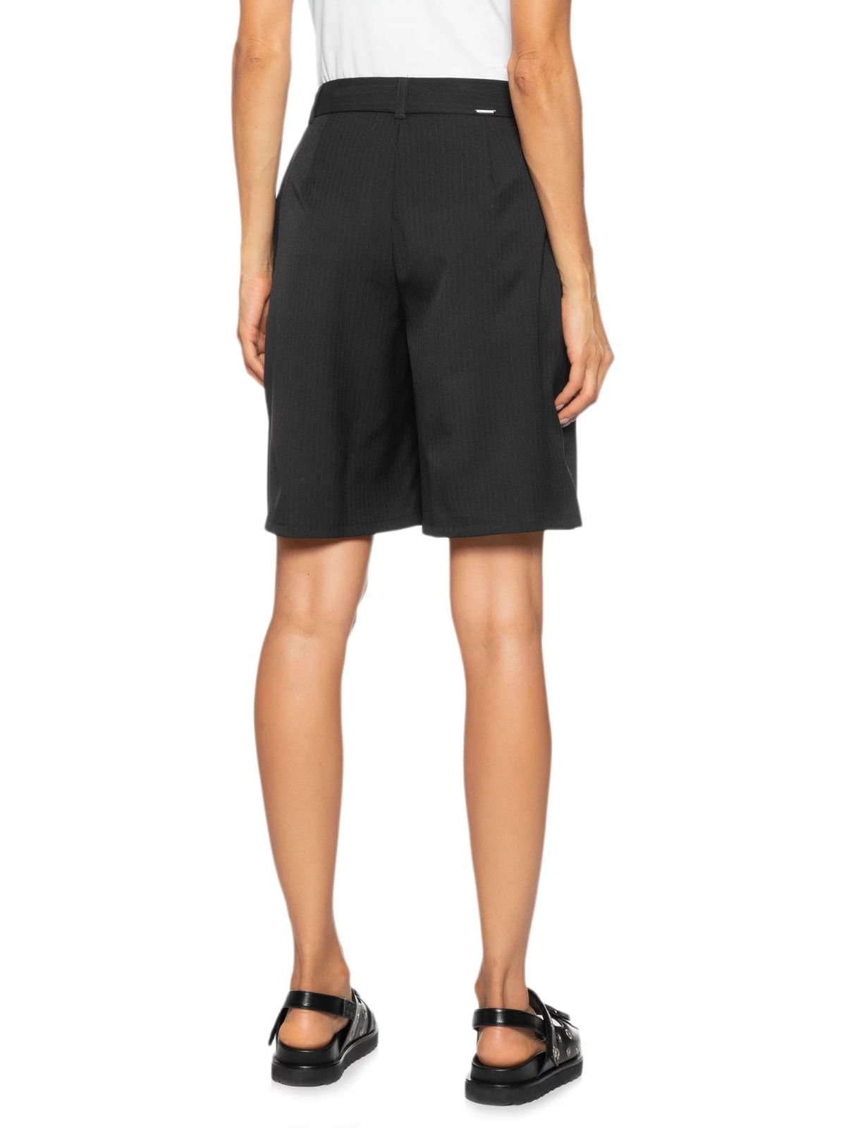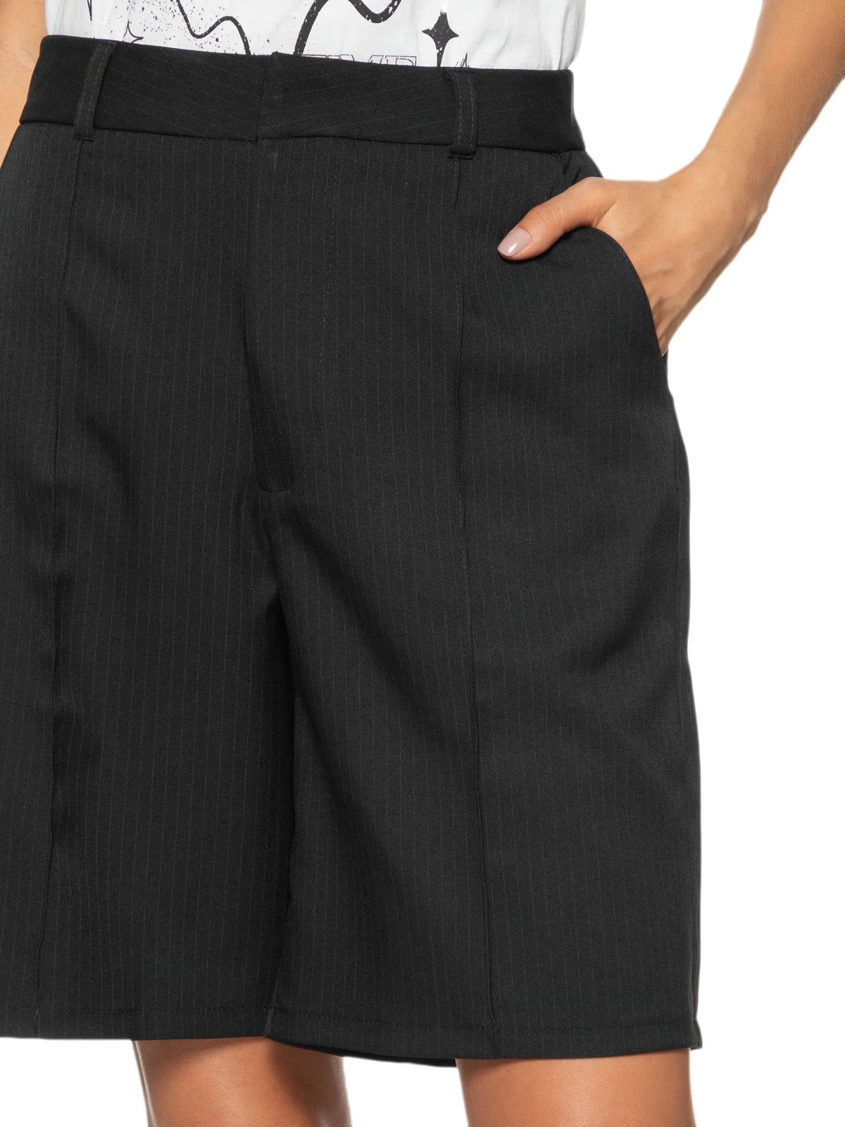 bermuda preta é confeccionado por tecido leve com baixa elasticidade. A peça solta ao corpo possui cintura alta, bolsos frontais no modelo faca, detalhe de nervuras na parte frontal, tag da marca metalizada aplicada na parte posterior, padronagem risca de giz em cor contrastante, comprimento curto e fechamento frontal por zíper e colchete.