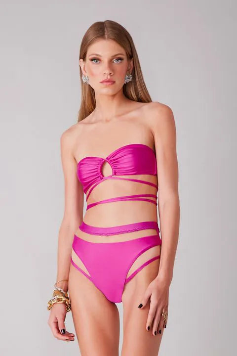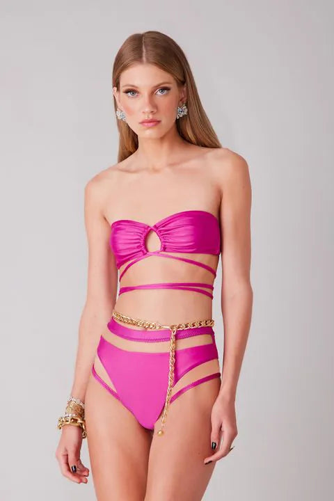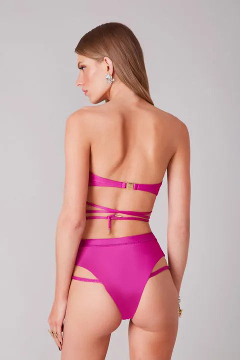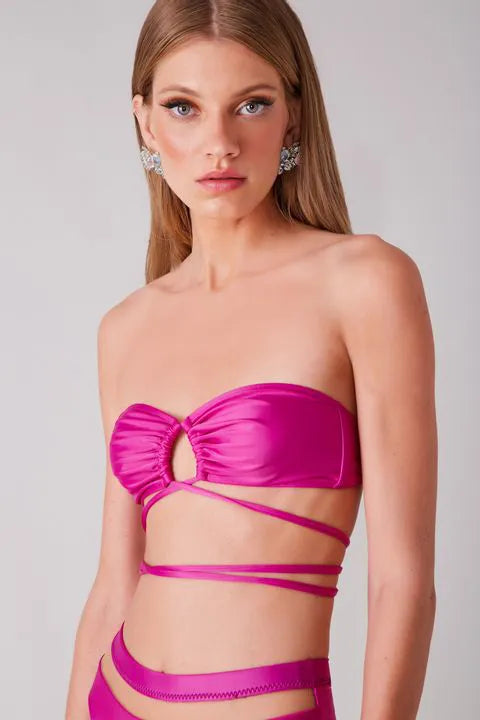 O top valoriza o busto. A peça de cima possui modelagem tomara que caia, com tiras que se cruzam abaixo do busto e fechamento posterior por encaixe de metal dourado, elementos que oferecem maior sustentação, e conferem um belo visual.