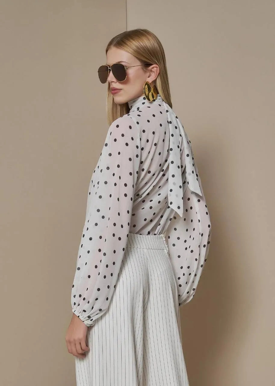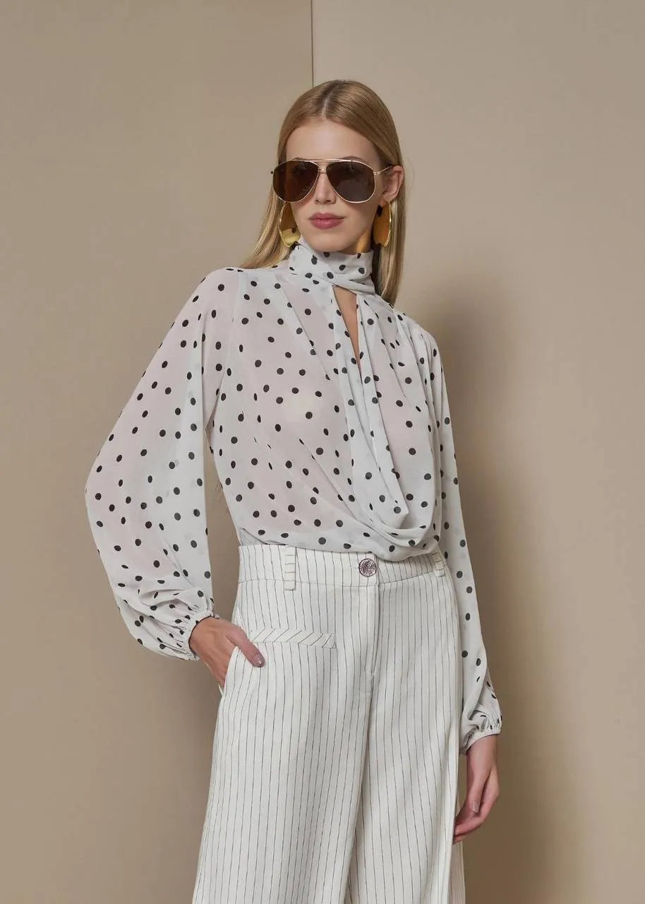 A elegância encontra a leveza nesta blusa off-white estampada, perfeita para quem ama looks femininos com toque sofisticado. A gola com faixa para amarração permite variações de estilo, do laço delicado ao caimento fluido, enquanto o detalhe em rolotê no decote adiciona charme sutil na medida certa. As mangas longas com volume e punho com elástico trazem movimento e modernidade, criando um visual romântico e atemporal. Combine com alfaiataria clara para um mood clássico ou com jeans para um contraste fresh e contemporâneo.