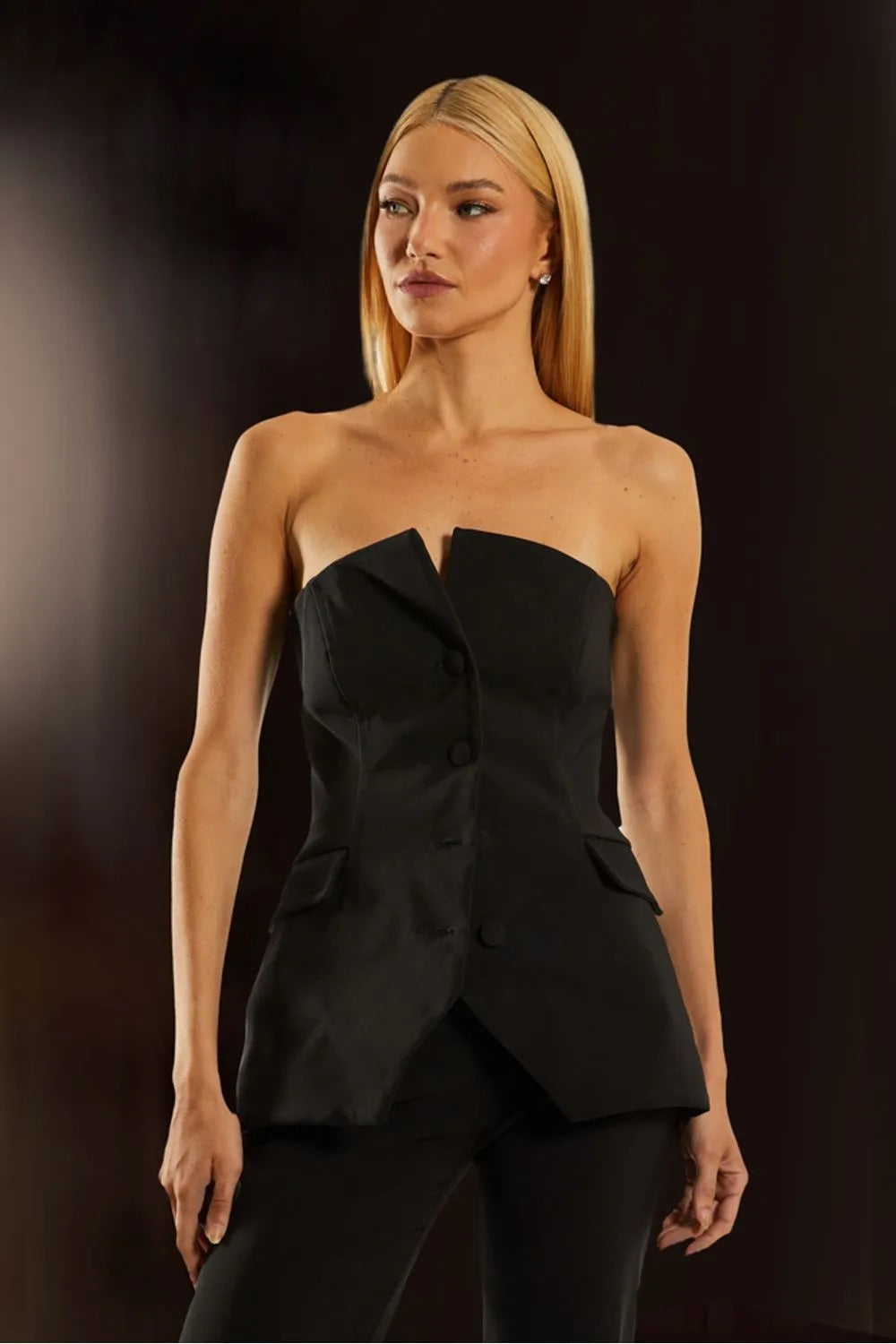 Confeccionada em crepe estruturado de alta qualidade, esta blusa oferece uma modelagem tomara que caia que destaca os ombros de maneira elegante.
