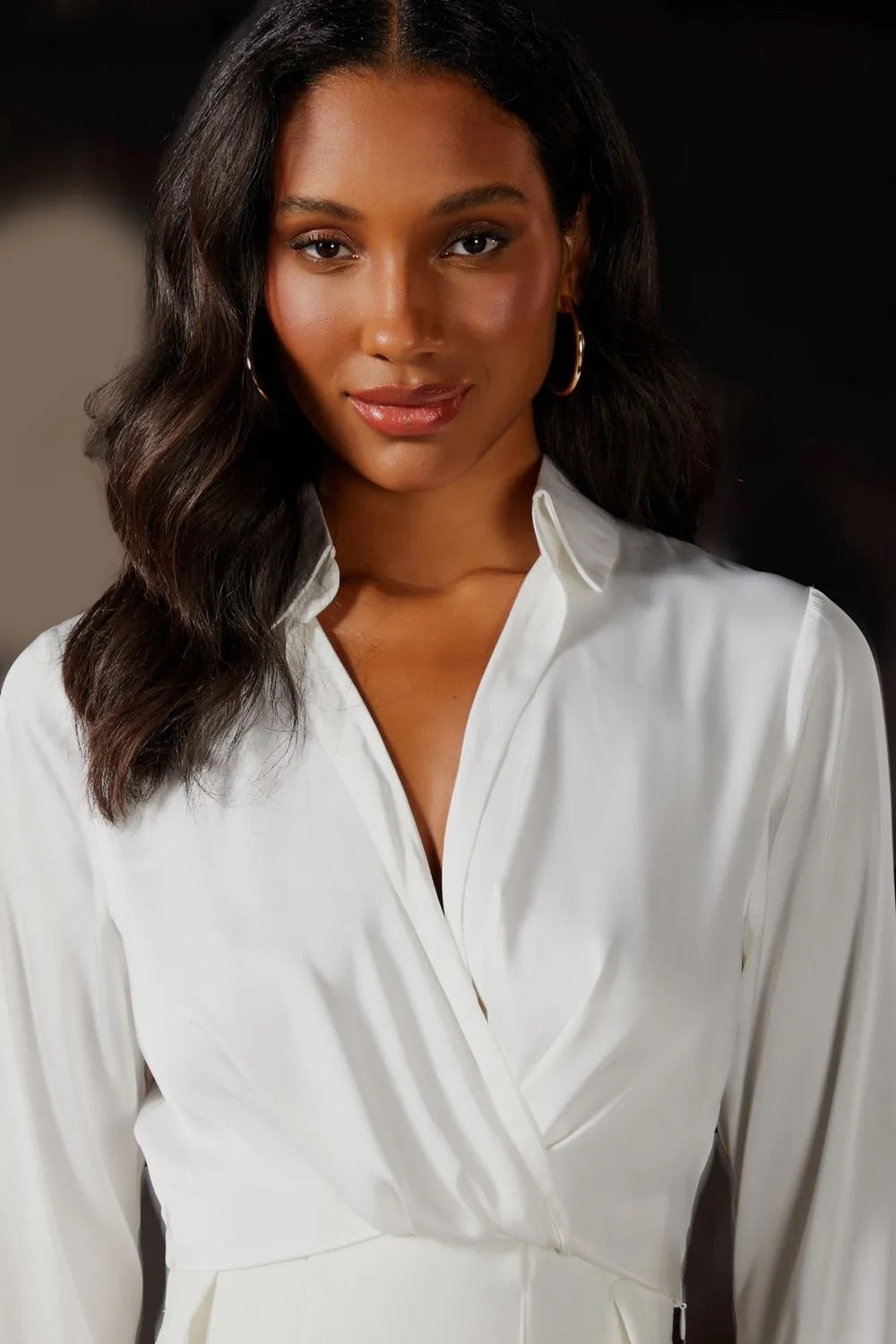 A gola camisa oferece um toque de formalidade, enquanto o decote V e as mangas longas garantem versatilidade para qualquer estação. Os franzidos delicados no busto não são apenas um detalhe encantador, mas também adicionam textura visual à peça.