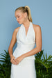Decote drapeado que cria movimento e faixa nas costas para ajuste delicado, unindo conforto e feminilidade