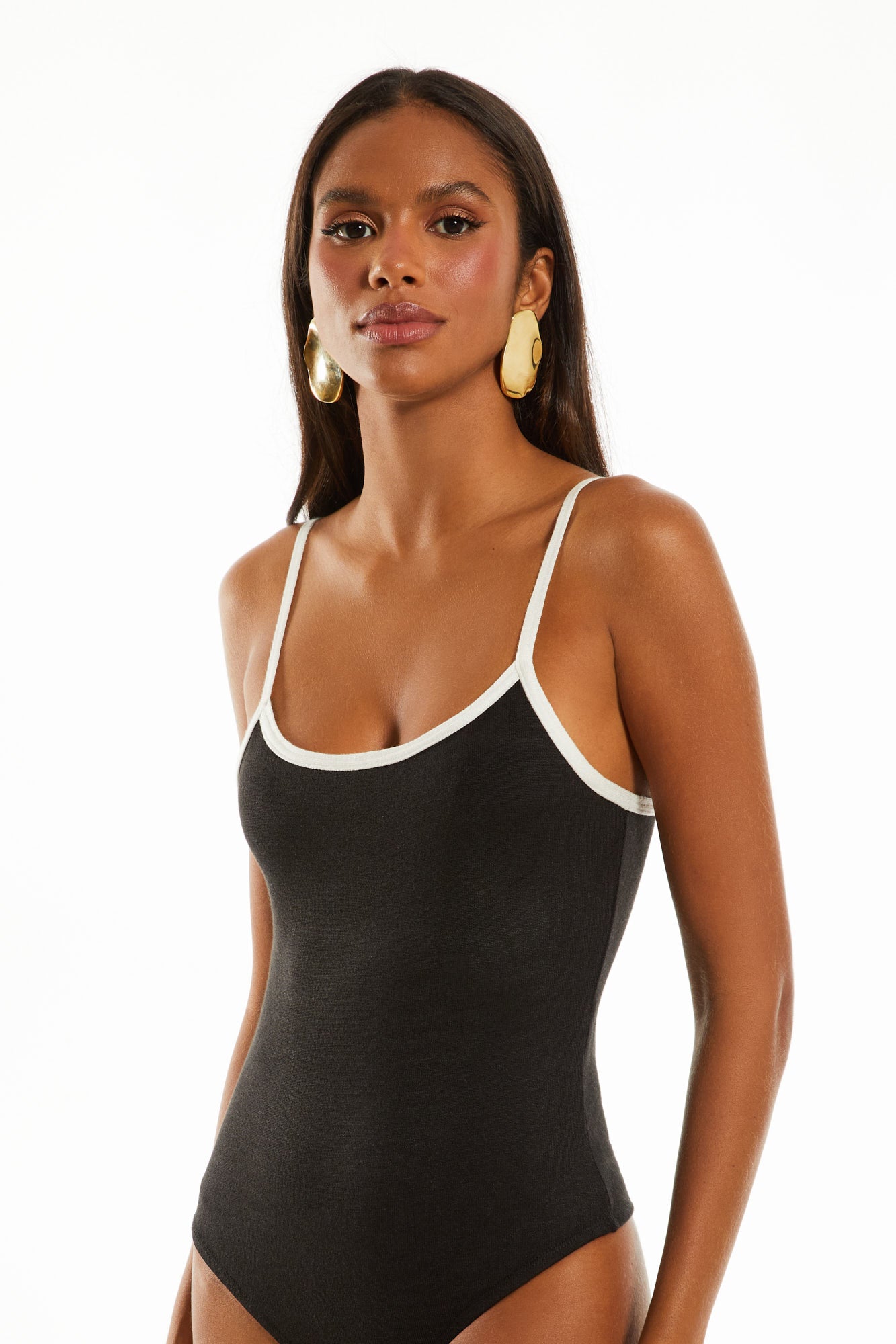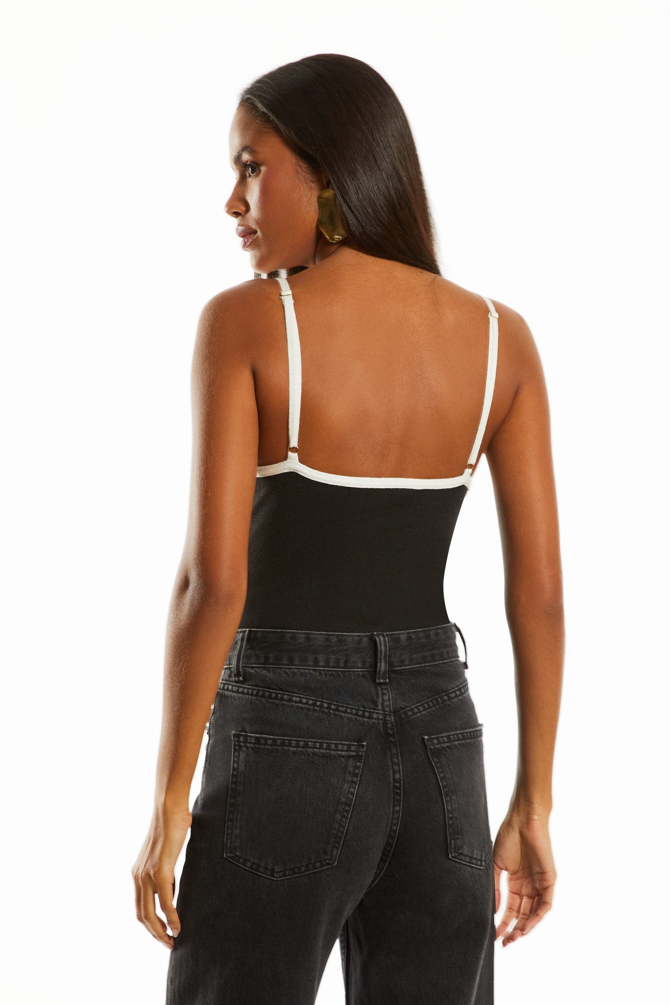 Body preto confeccionado em tricot. Possui alças finas com reguladores, decote em u e acabamentos em viés na cor off white.