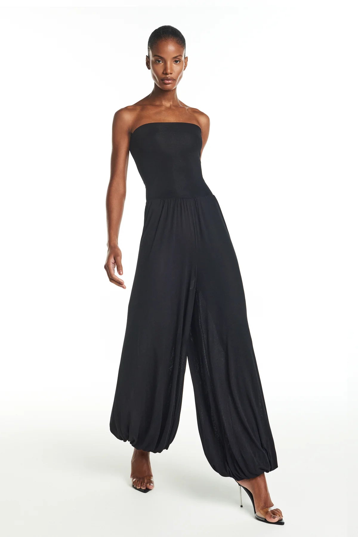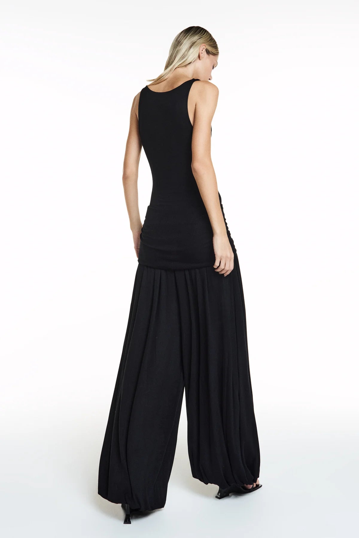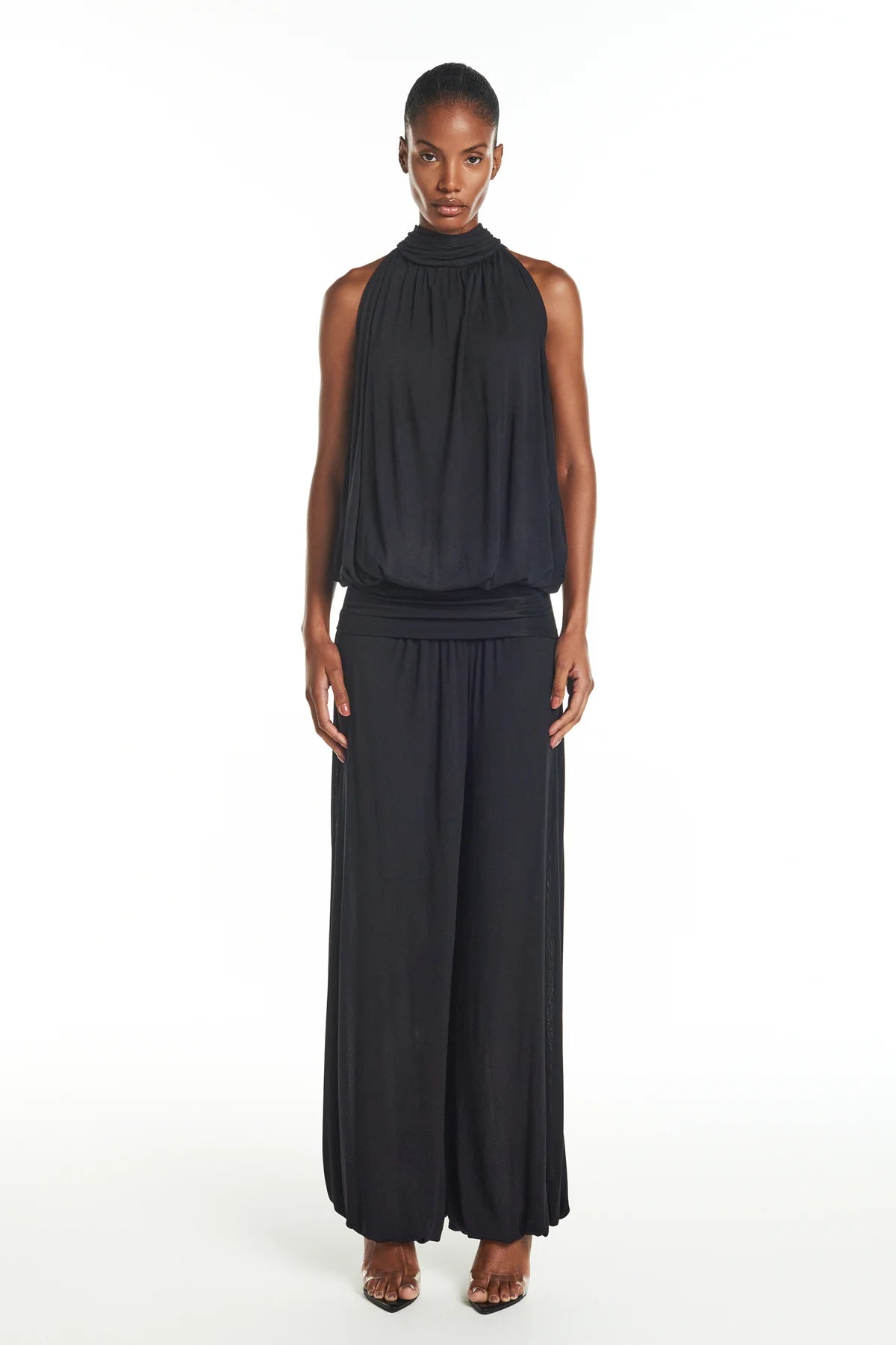 Calça Aladim de malha com toque macio. Modelagem ampla e caimento fluido e cós dobrável que permite ajustar a altura da cintura conforme a preferência para melhor ajuste ao corpo. O acabamento nas barras com elástico remete ao estilo Aladim e não possui fechamento.