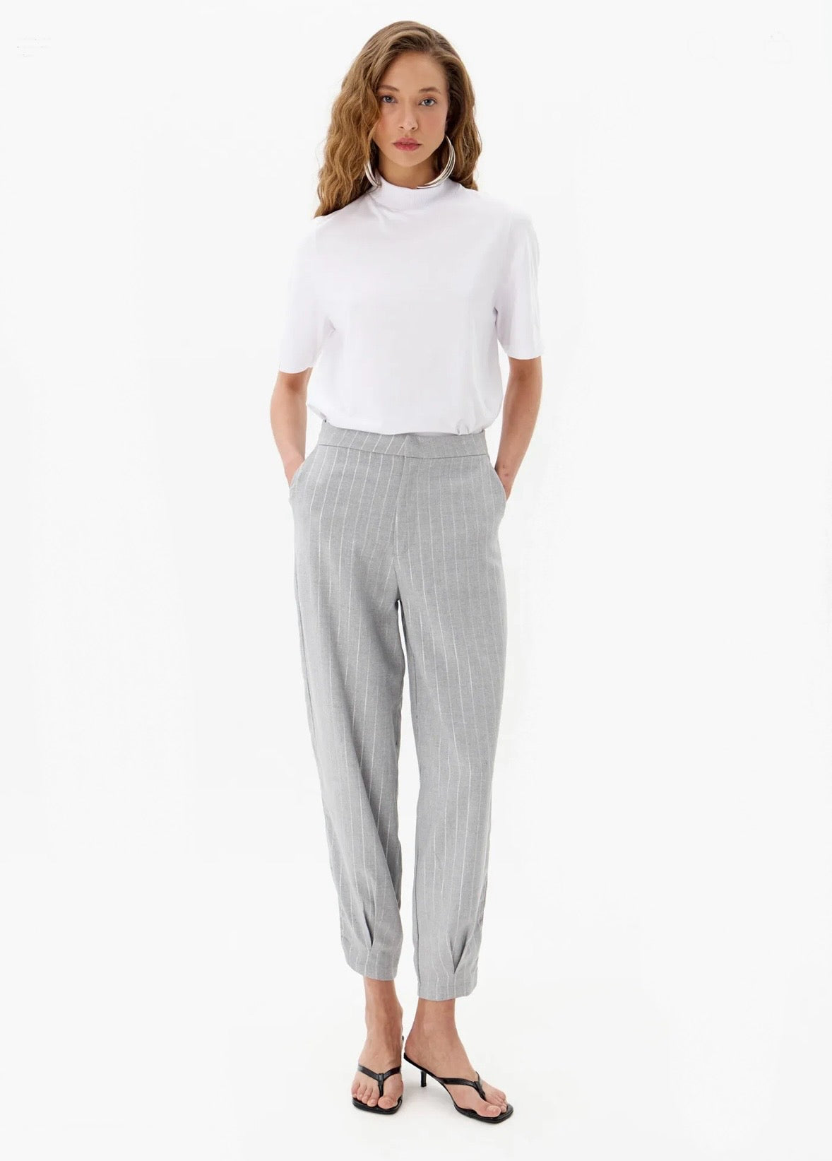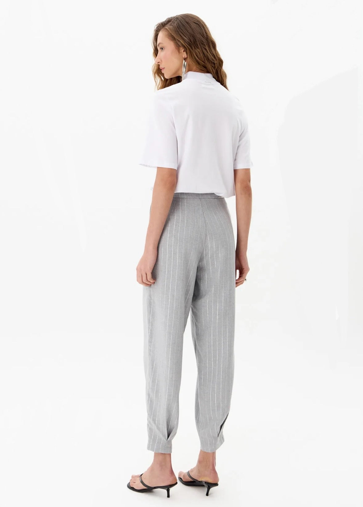 Calça de alfaiataria no modelo balloon, que combina sofisticação com um toque contemporâneo. Na cor cinza, conta com detalhes em risca prata que adicionam elegância discreta e moderna. Ideal para composições refinadas no dia a dia ou em ocasiões especiais