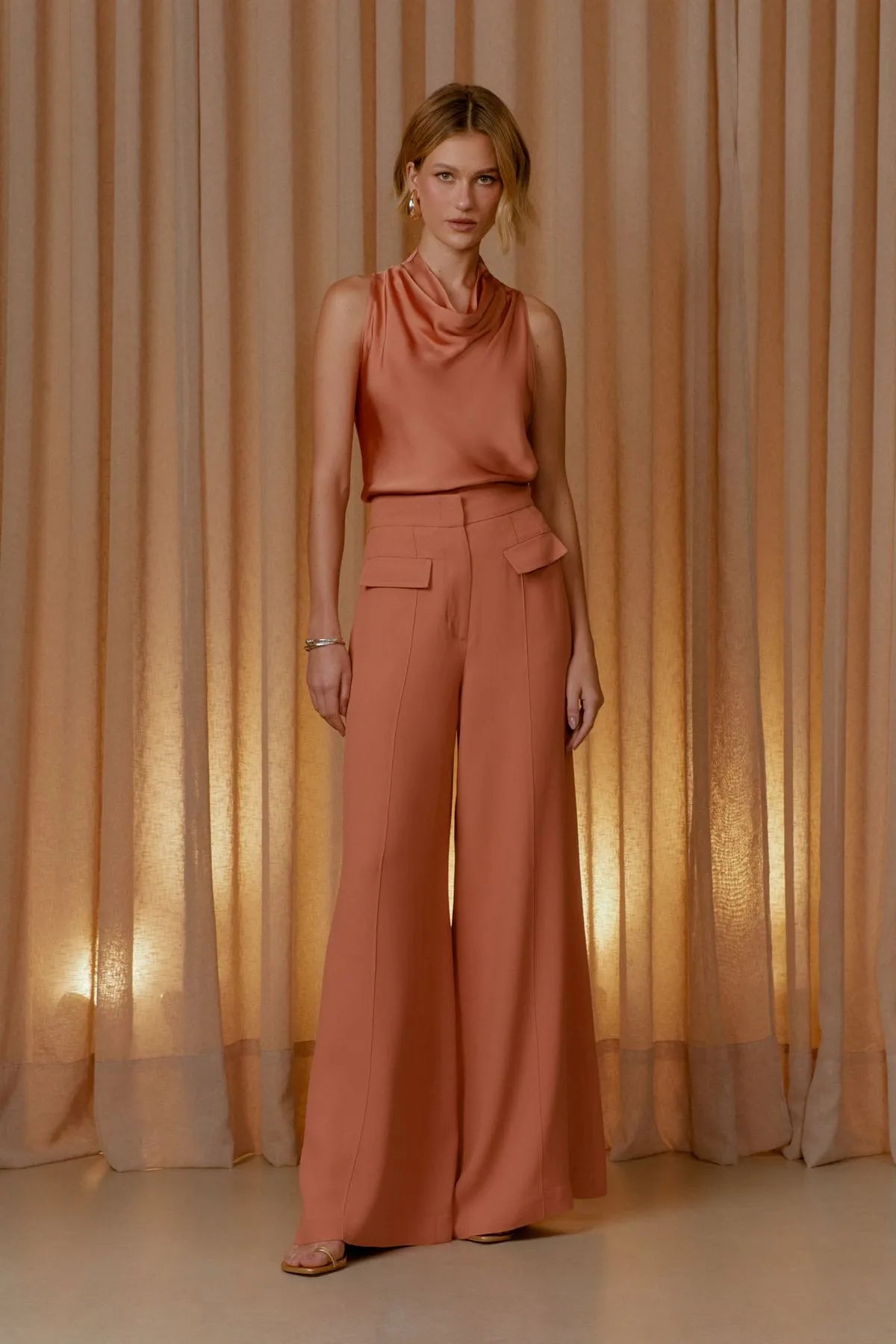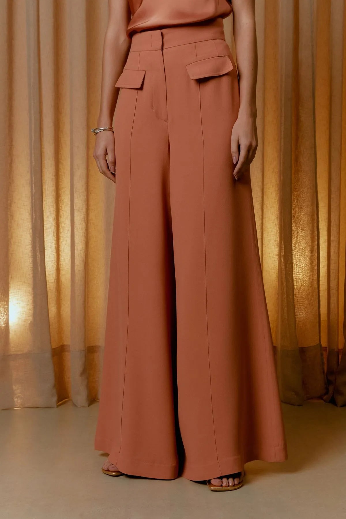 O modelo pantalona desta calça oferece uma silhueta ampla e fluida que adiciona sofisticação ao visual.