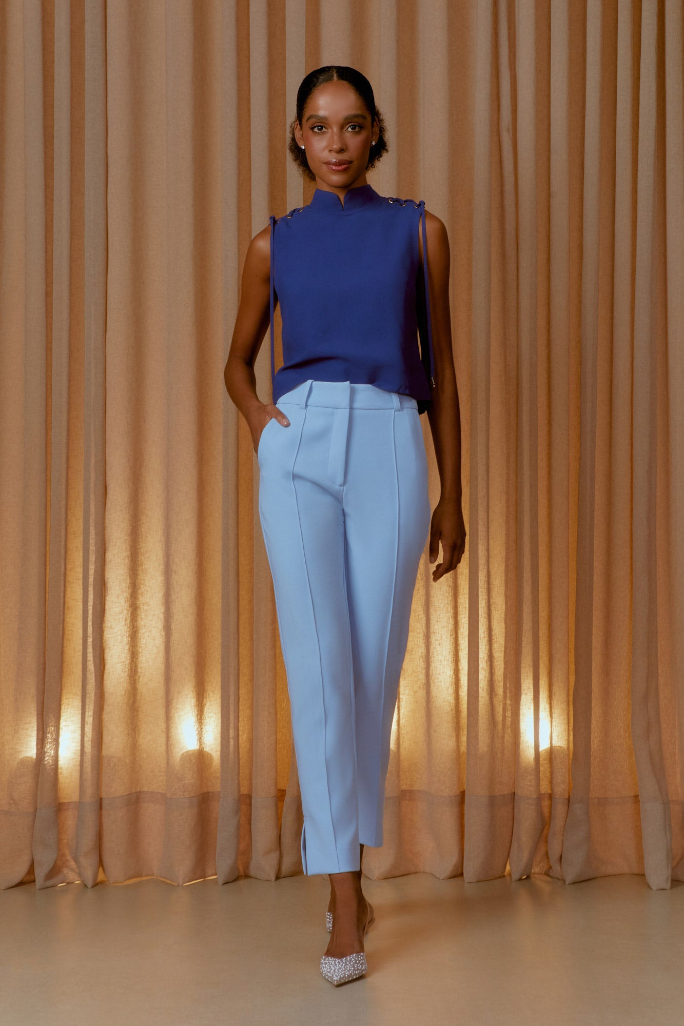 Calça alfaiataria azul claro em crepe com elastano. Modelagem reta com nervura frontal, cós com passantes simples na parte da frente e passante duplo pregado na diagonal na parte posterior. O fechamento é frontal por zíper e fecho interno.