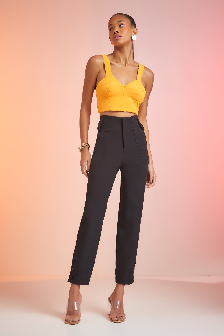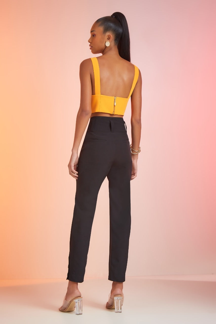 Calça em alfaiataria, cintura alta com detalhes de botões na lateral inferior da peça. A calça possui passantes, dois bolsos na parte posterior e dois bolsos na parte frontal. Muito elegante e confeccionada em tecido leve e confortável.