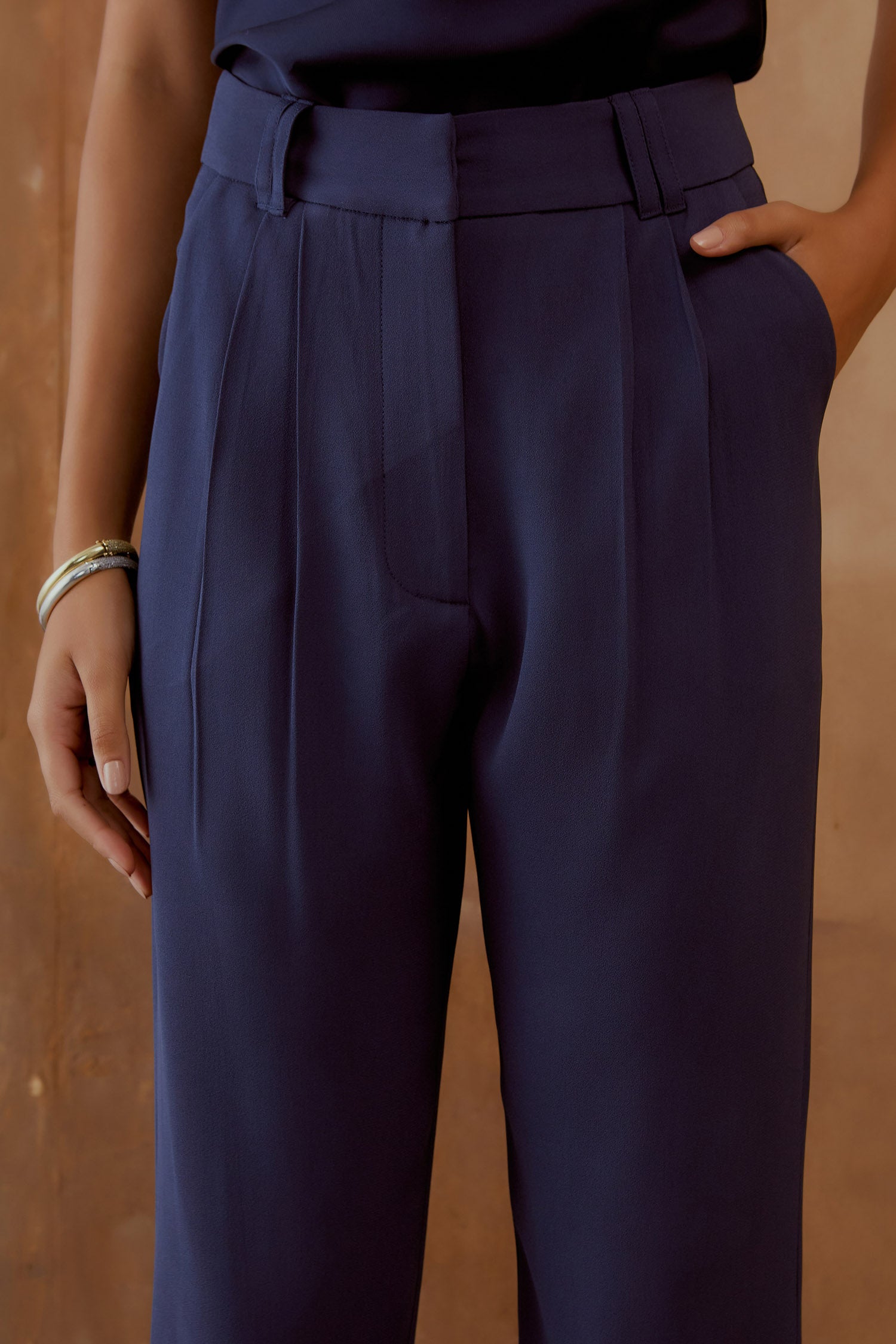 Calça cropped desenvolvida em crepe com pregas e bolsos frontais, cós com passantes, bolsos embutidos traseiros e fechamento por zíper e botão interno.