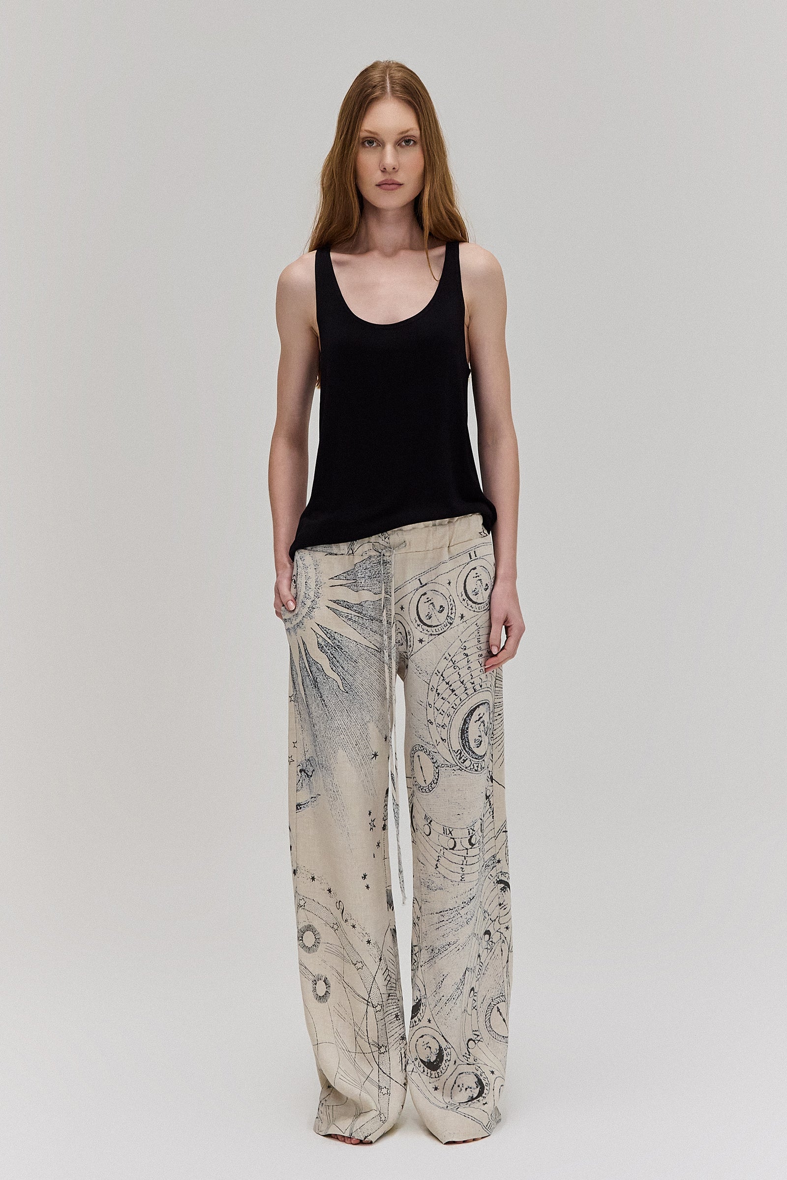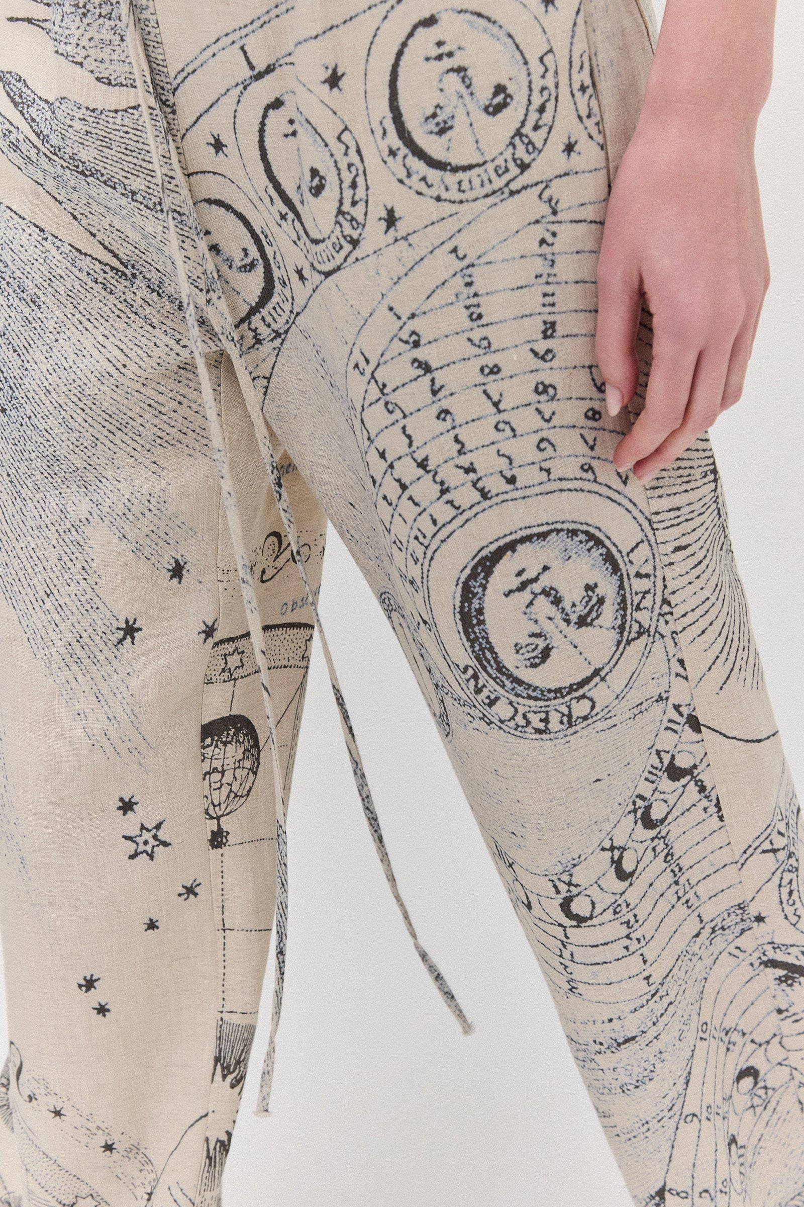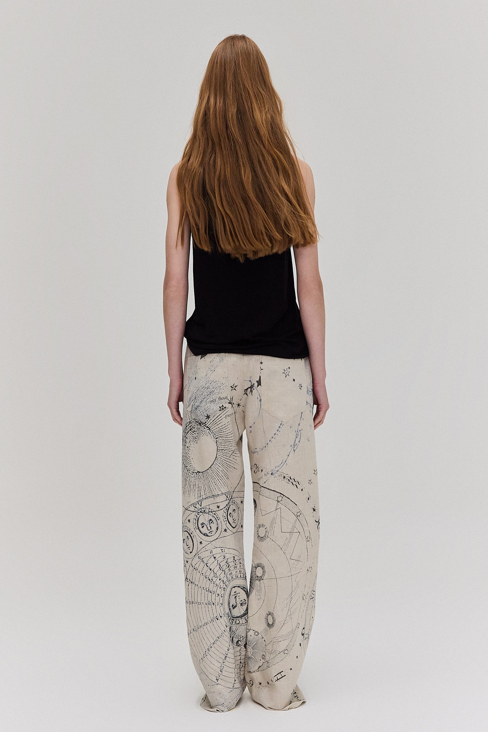 Calça em linho. Possui modelagem reta e shape soltinho. Possui cintura alta e cós com elástico. Não Possui fechamento.