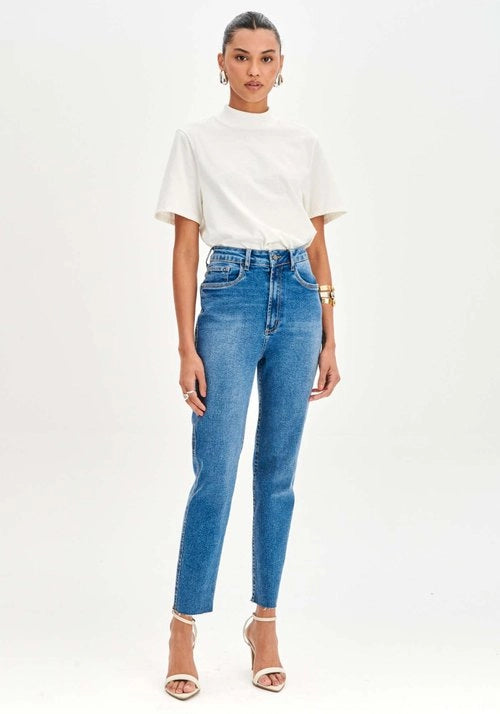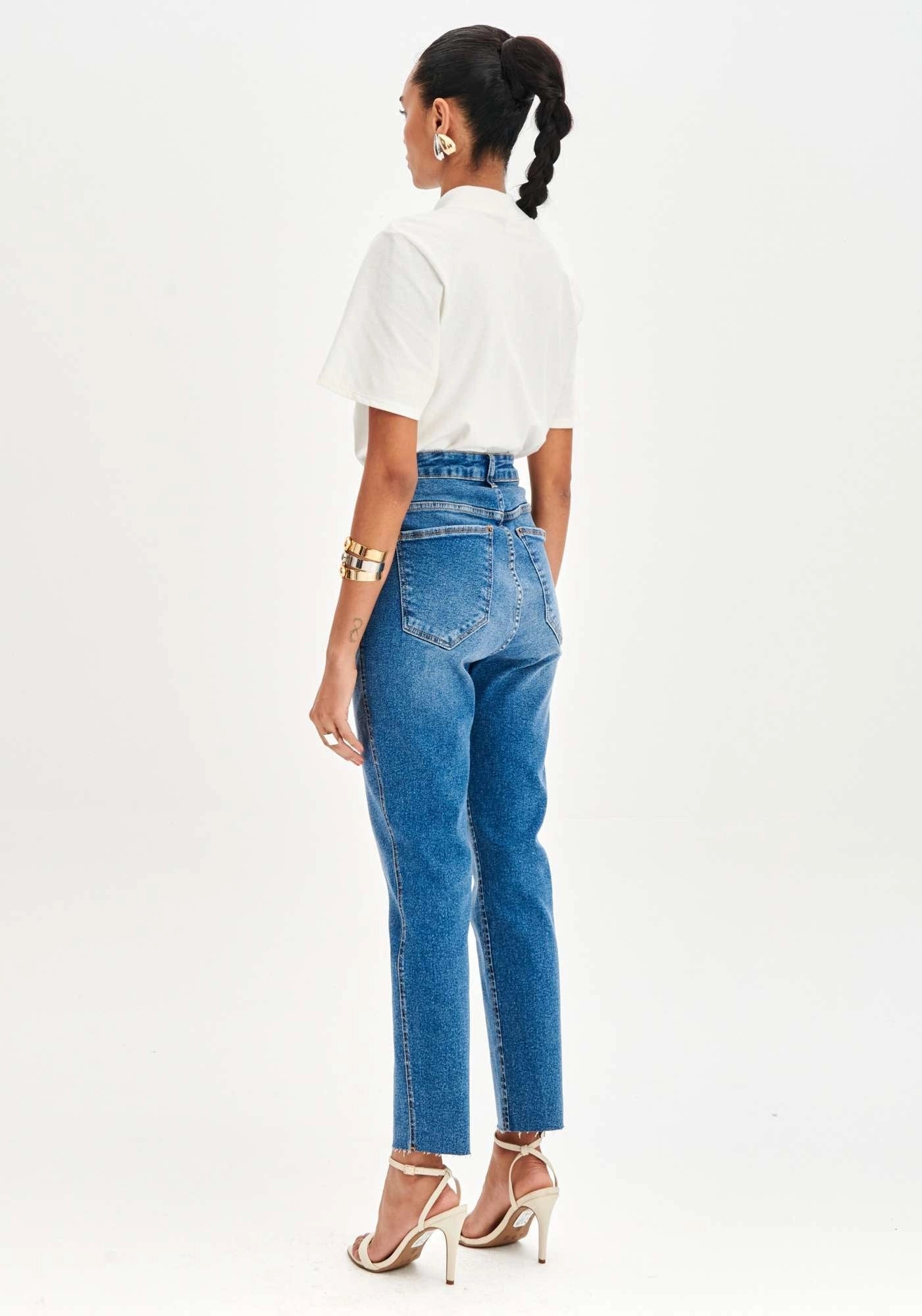 Calça jeans com modelagem mom jeans e cintura super alta.
