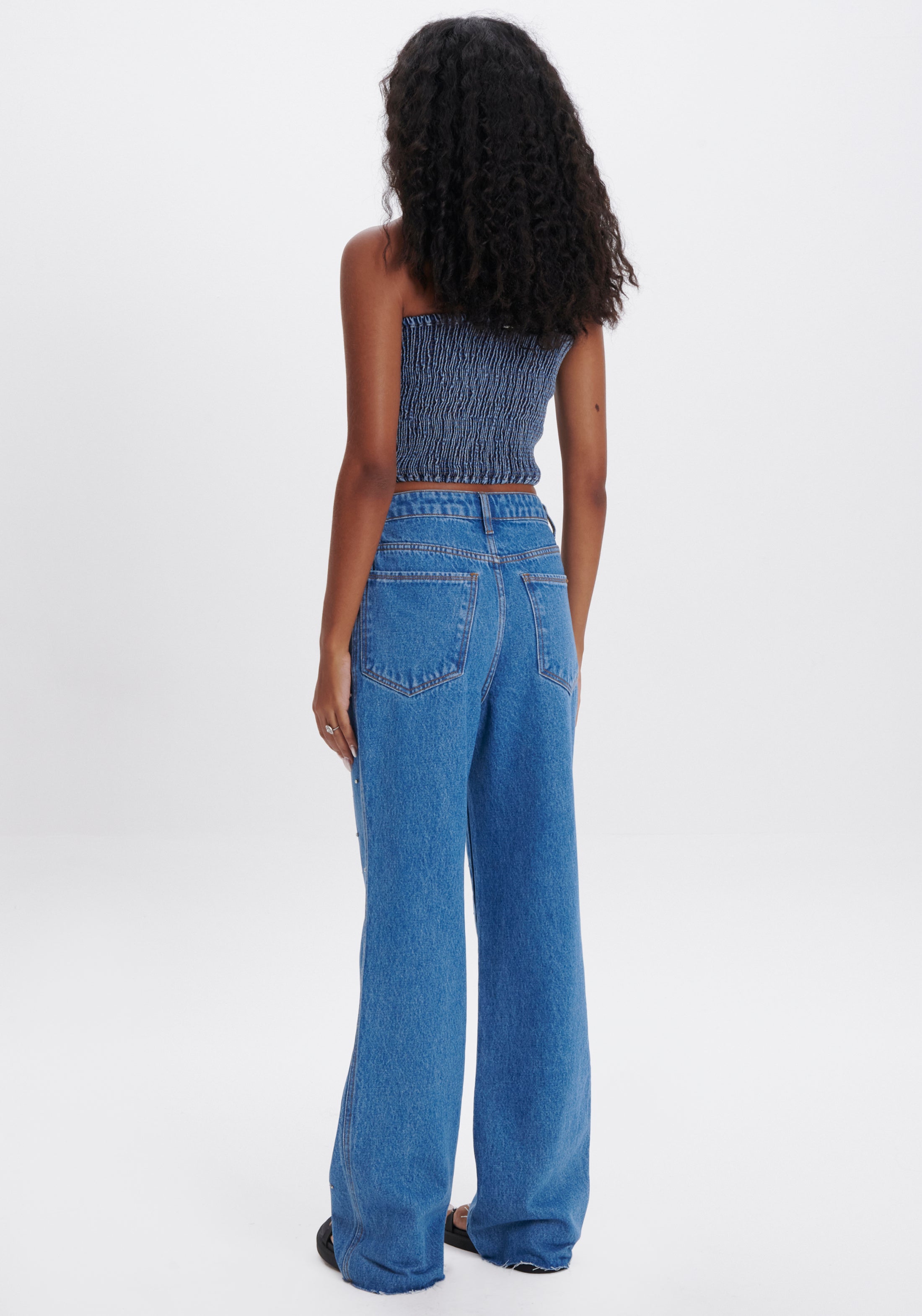 Calça jeans com lavagem média. Tendo cós alto com passadores de cinto, bolsos, barra desfiada e aplicações de brilho em sua extensão, essa calça jeans é simplesmente apaixonante. Sua modelagem wide leg é a escolha perfeita para as fashionistas que amam estar confortáveis sem abrir mão do estilo.