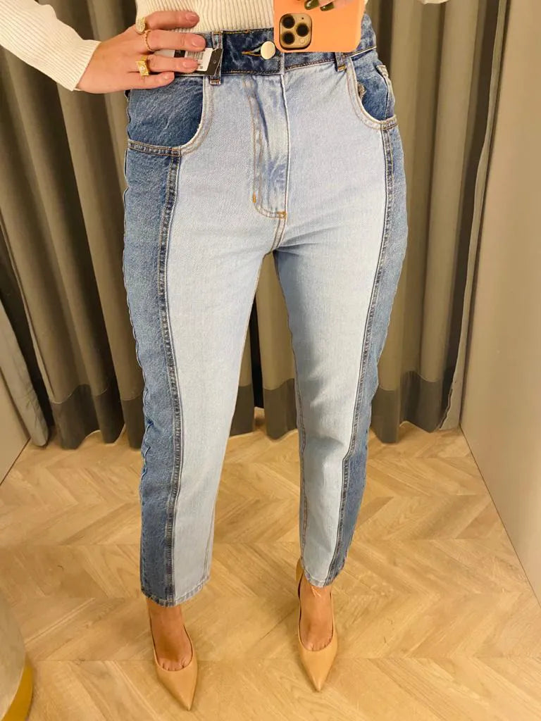 A peça é feita em dois tons de jeans, conta com cós largo com cintura alta, corte que modela o corpo, bolsos, zíper com botão metálico, acabamento em pesponto e as cores contrastantes que são o diferencial ao look.