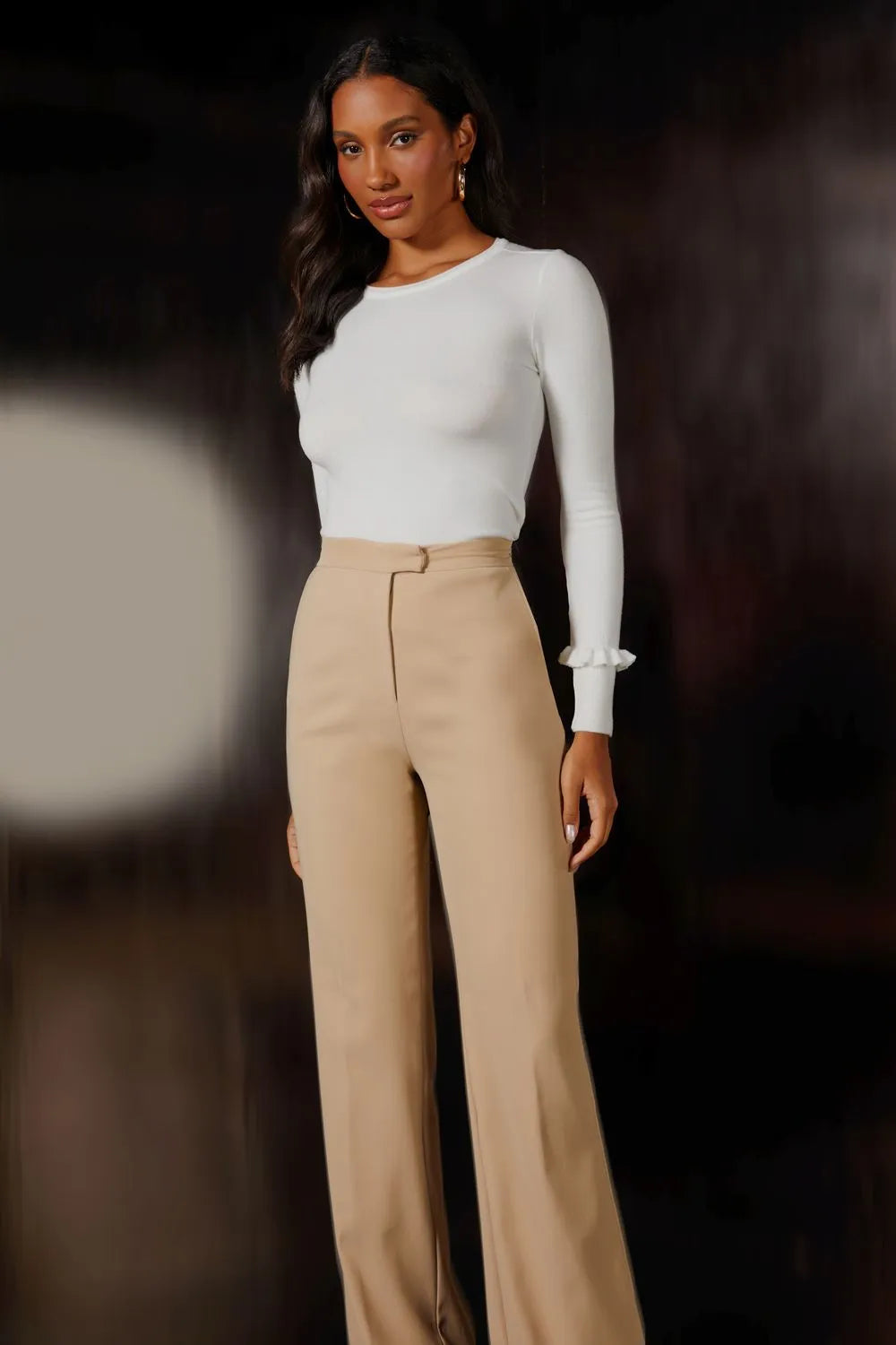 A calça confeccionada em crepe estruturado destaca-se pela sua elegância e versatilidade.
