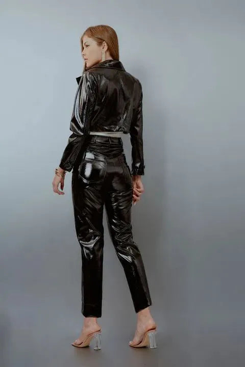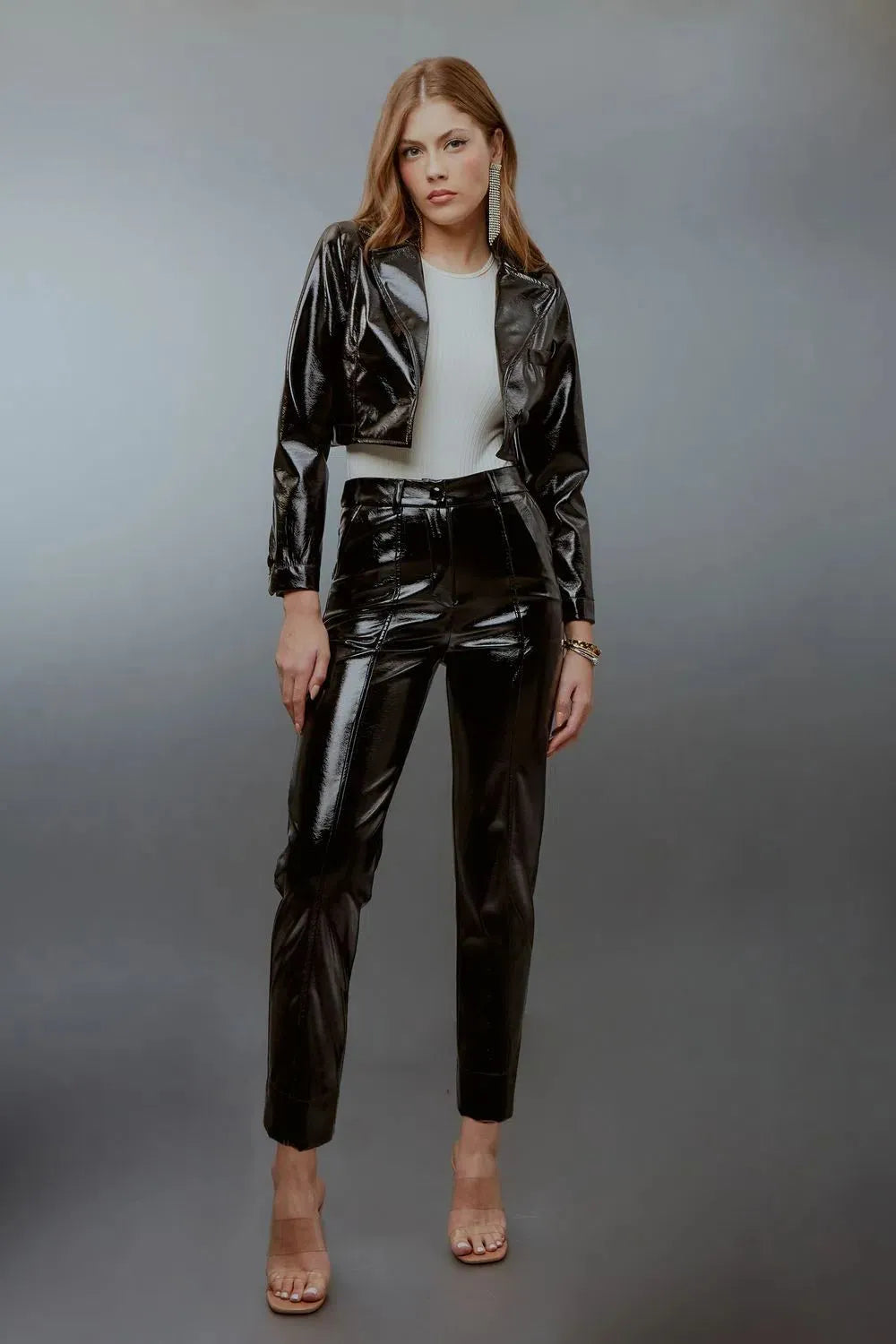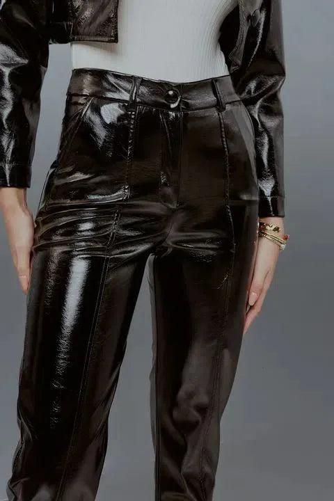 Calça cintura alta reta alfaiataria. Tecido base de malha e recoberto com poliuretano. Possui caimento estruturado, com cobertura brilhosa e efeito vinil, conferindo um visual moderno e tecnológico à peça. Atenção: observar modo de uso.