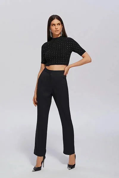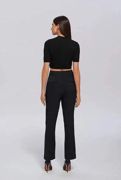 A calça preta é confeccionada em crepe alfaiataria. A peça apresenta modelagem cenoura e pregas anteriores, que proporcionam um visual elegante e moderno. Possui cós alto, bolso laterais em modelo faca, caimento levemente solto ao corpo e acabamento pespontado. Fecho anterior por zíper e colchete metálico.