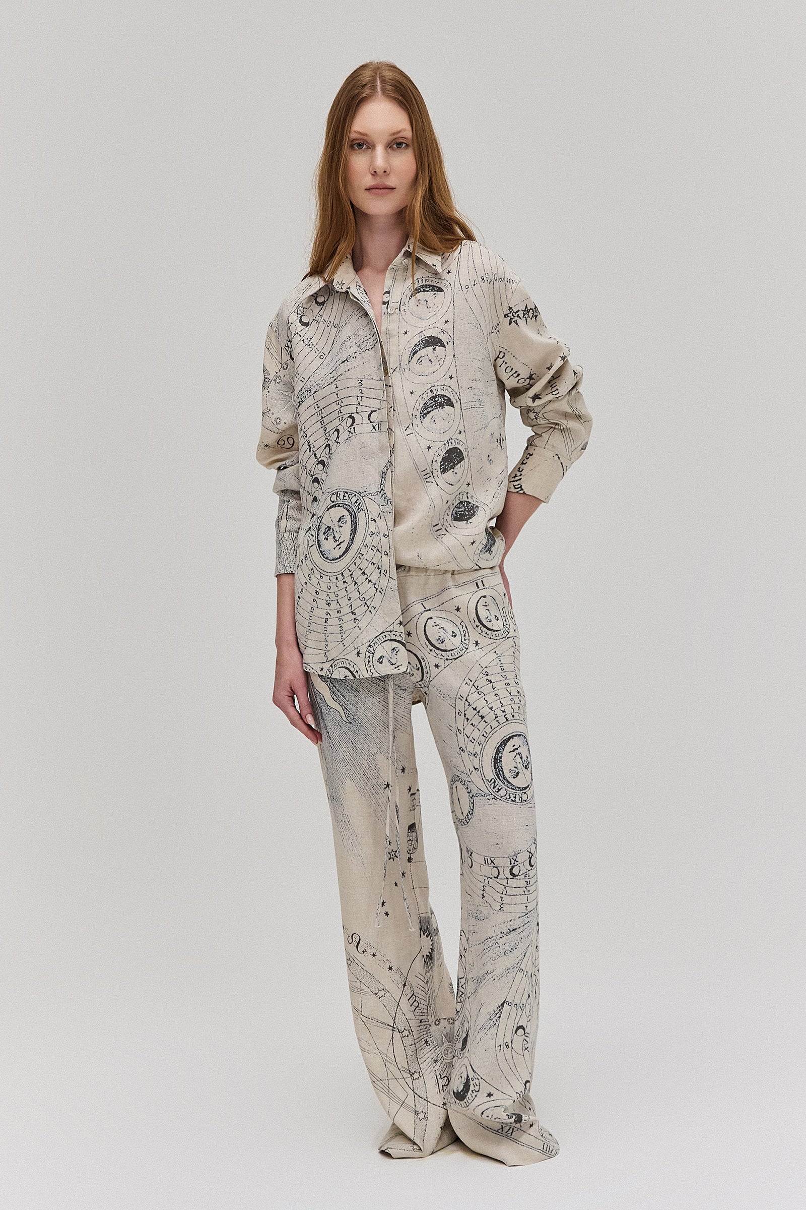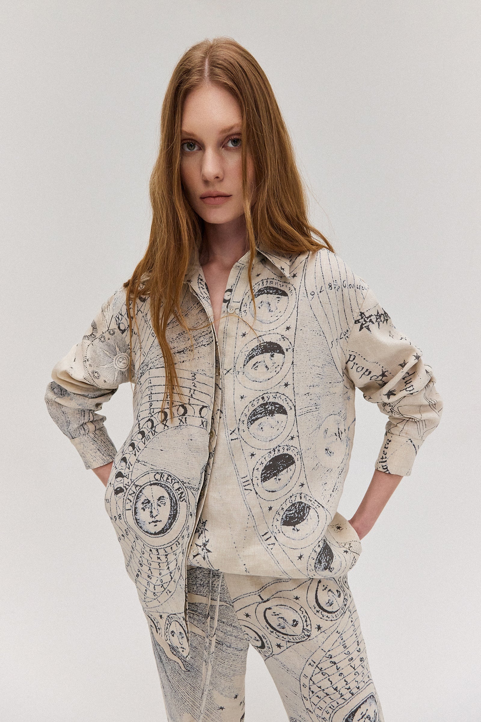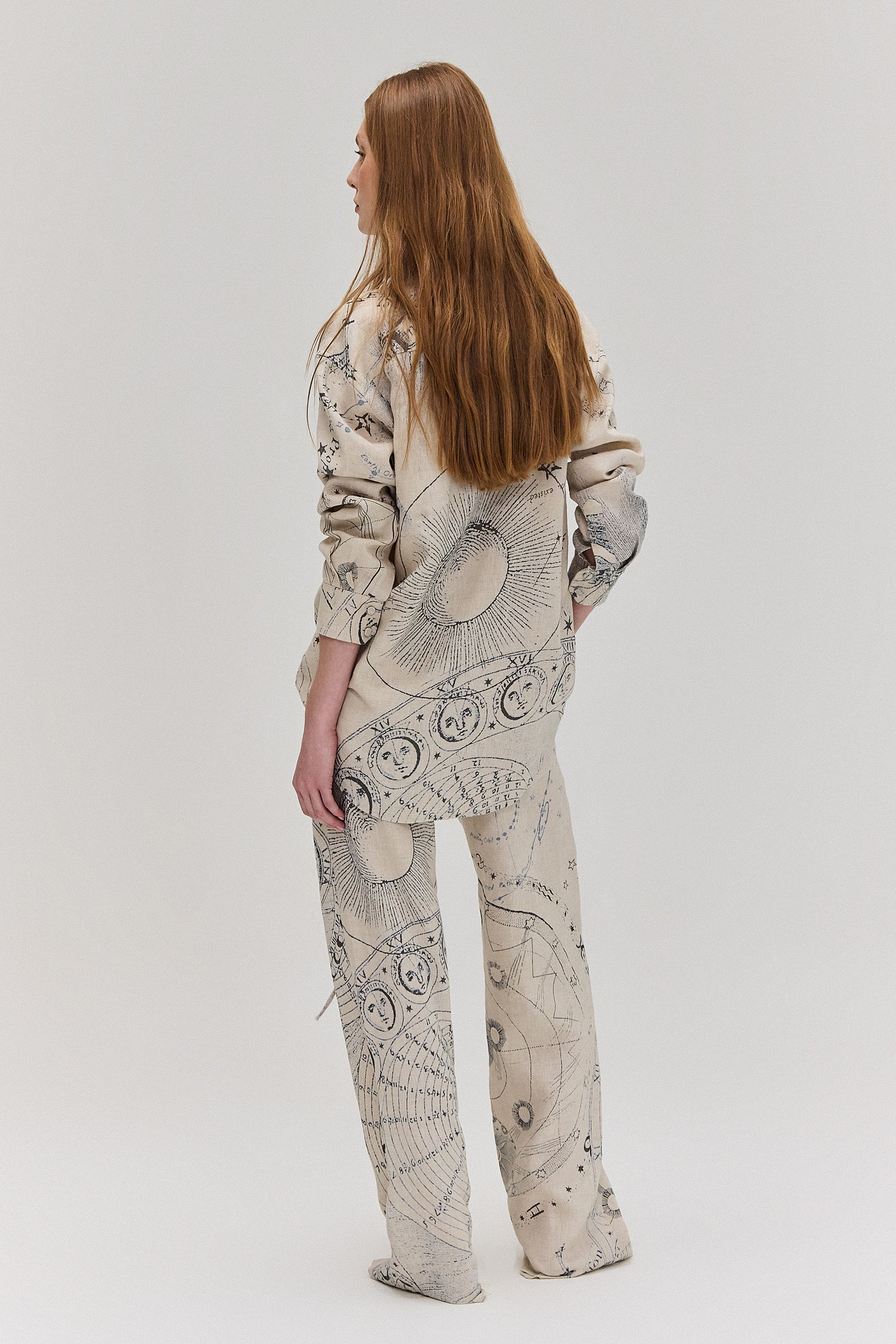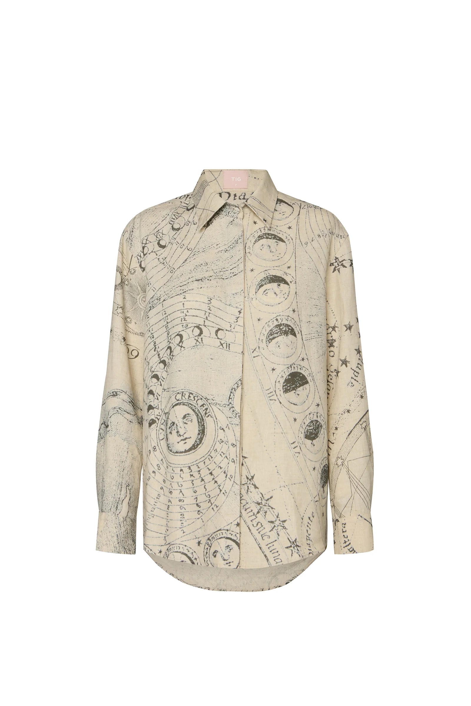 Camisa comprida em cambraia de linho. Modelagem ampla e manga comprida. Possui barrado arredondado com a parte de trás mais comprida. Fechamento por abotoamento frontal e nos punhos.