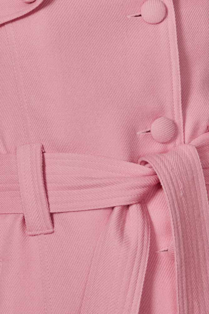 Confeccionado em lã sem elasticidade. A peça solta ao corpo possui gola alta, mangas longas com passantes e martingale aplicado nos punhos, bolsos frontais embutidos, tecido sobreposto a parte frontal com fechamento por botão encapado, passantes aplicados na cintura, forro, martingale aplicado na parte posterior e fechamento frontal por botões. Acompanha cinto de espessura média e de mesmo tecido e cor para uso opcional.