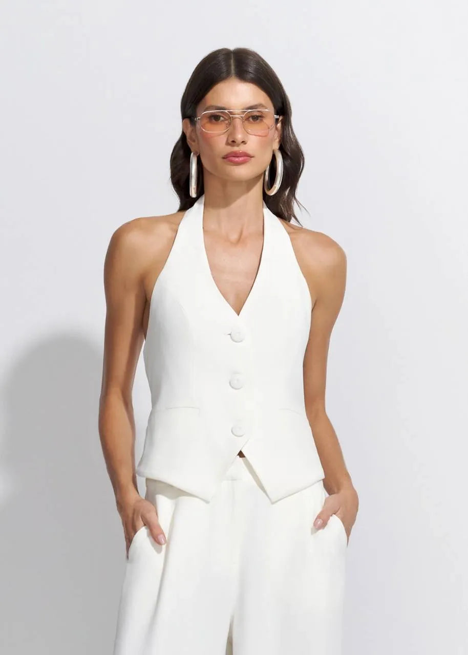 Versátil e elegante, o colete off white é a peça coringa que transforma qualquer produção. O decote halter realça o colo, enquanto o detalhe nas costas garante charme extra. Combine com pantalonas claras para um look sofisticado e clean ou use com saia mídi e rasteiras metalizadas para uma proposta leve e atual. Ideal para jantares, recepções e momentos onde estilo e personalidade são indispensáveis.