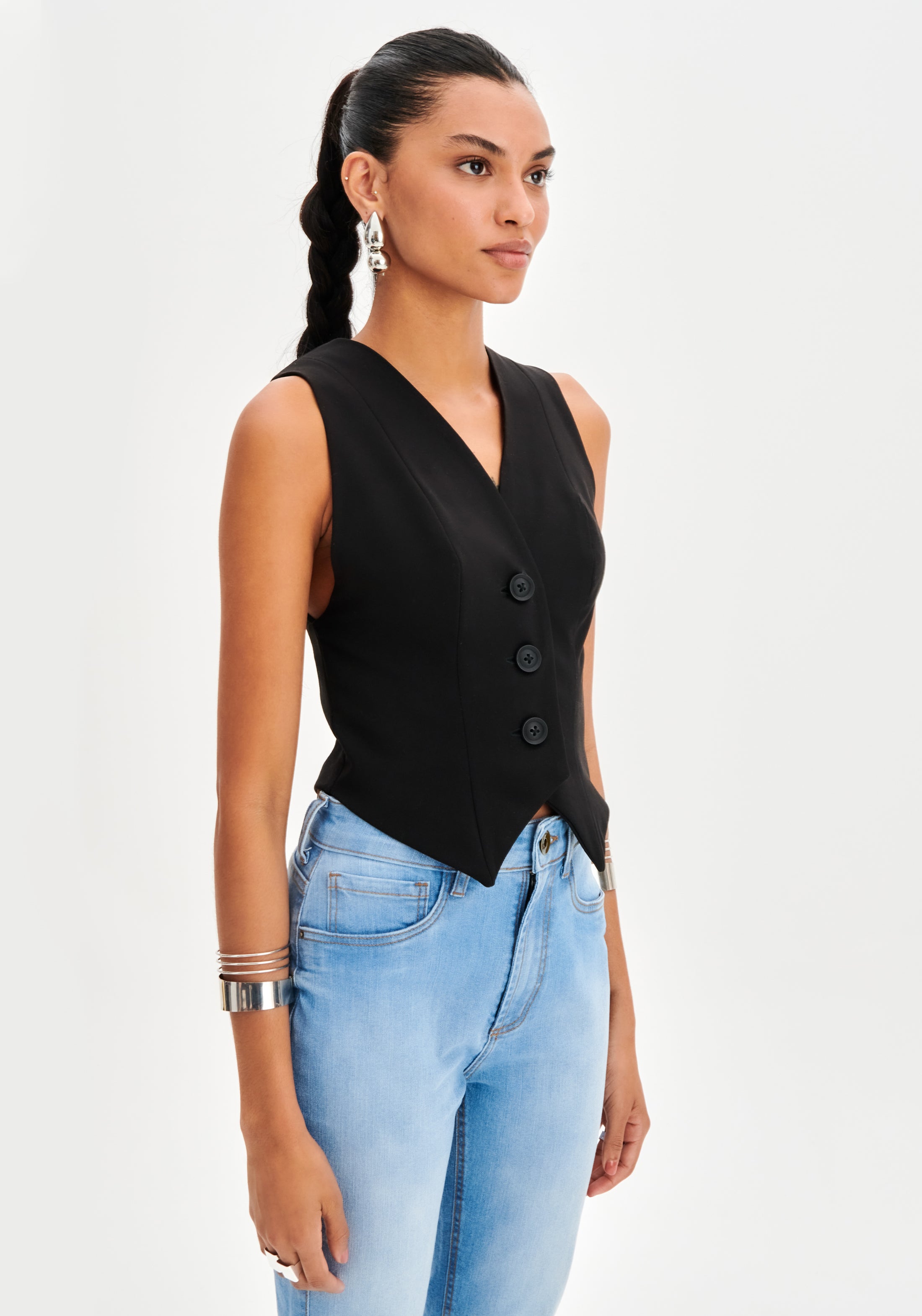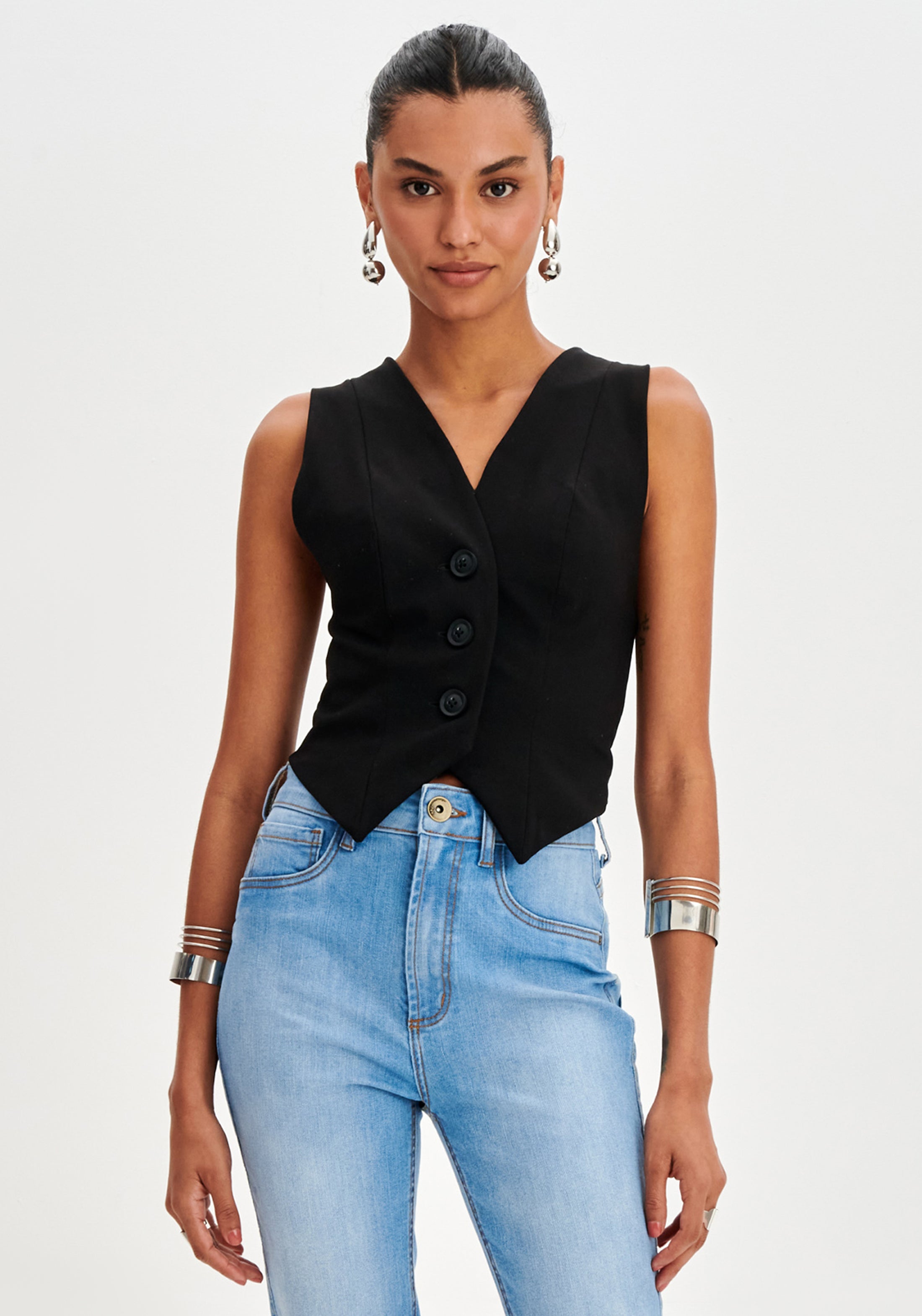 Estiloso e versátil, o colete curto de alfaiataria é a escolha ideal para um look moderno. Com botões frontais, ele adiciona um toque chic ao seu visual. Combine com jeans para um visual descolado ou com alfaiataria para uma produção elegante.