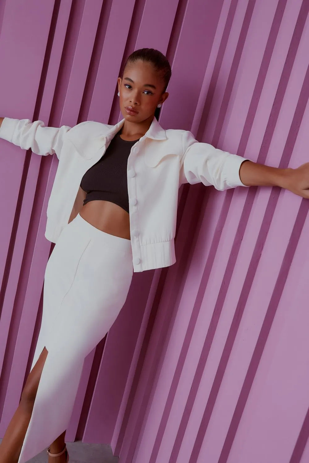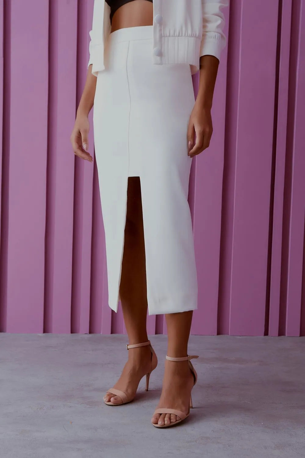 Conjunto casaco cós largo e barbatana para estruturar, sobreposição abas e botões forrados. Saia midi lápis com fenda frente. Conjunto moderno e chique, confeccionado em tecido de alfaitaria twill.