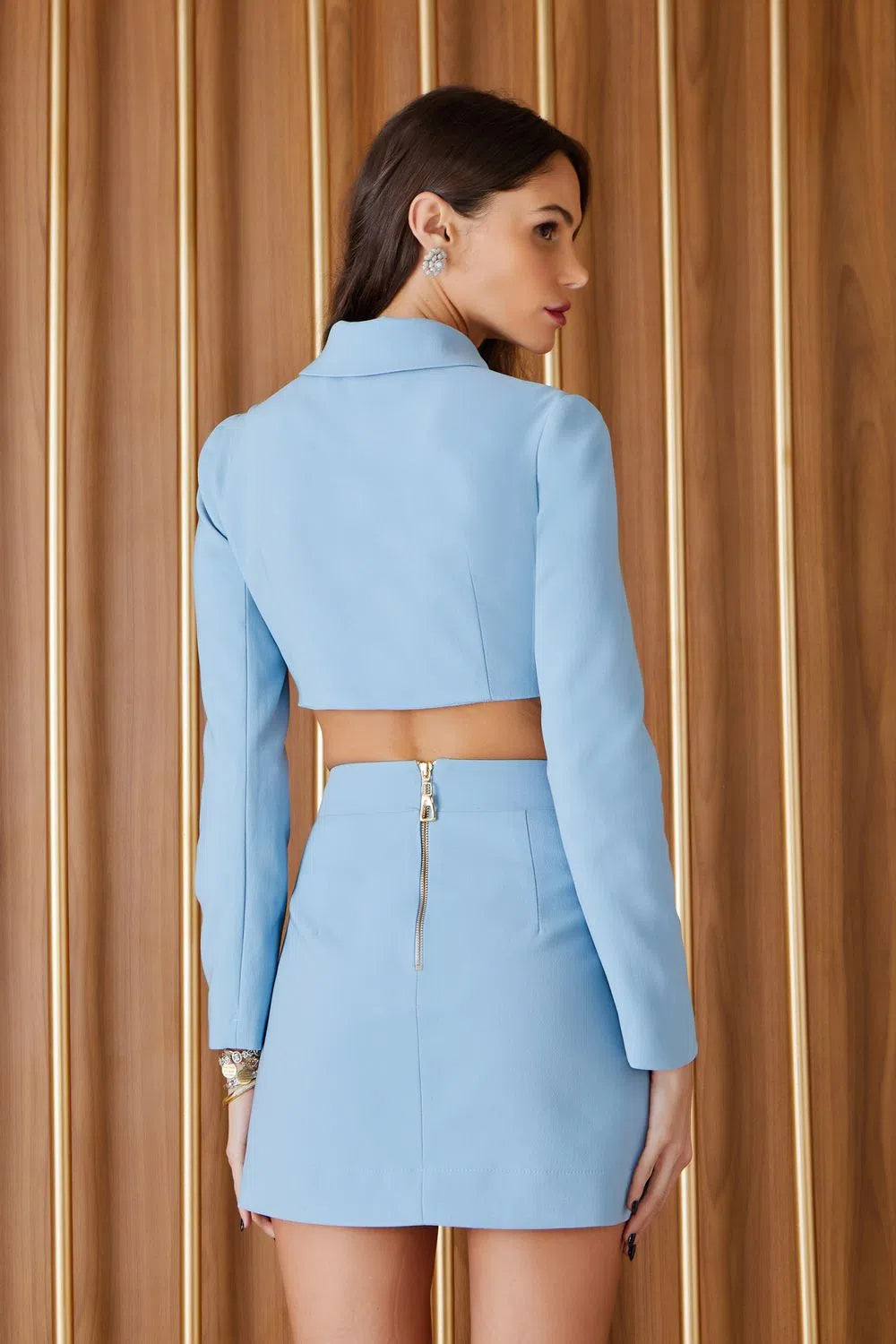 Top em modelagem cropped, possui gola, manga longa, bolsos frontais e fechamento por botões de metal dourado. Saia em cós alto possui bolsos frontais como detalhe e fechamento posterior por zíper de metal dourado.
