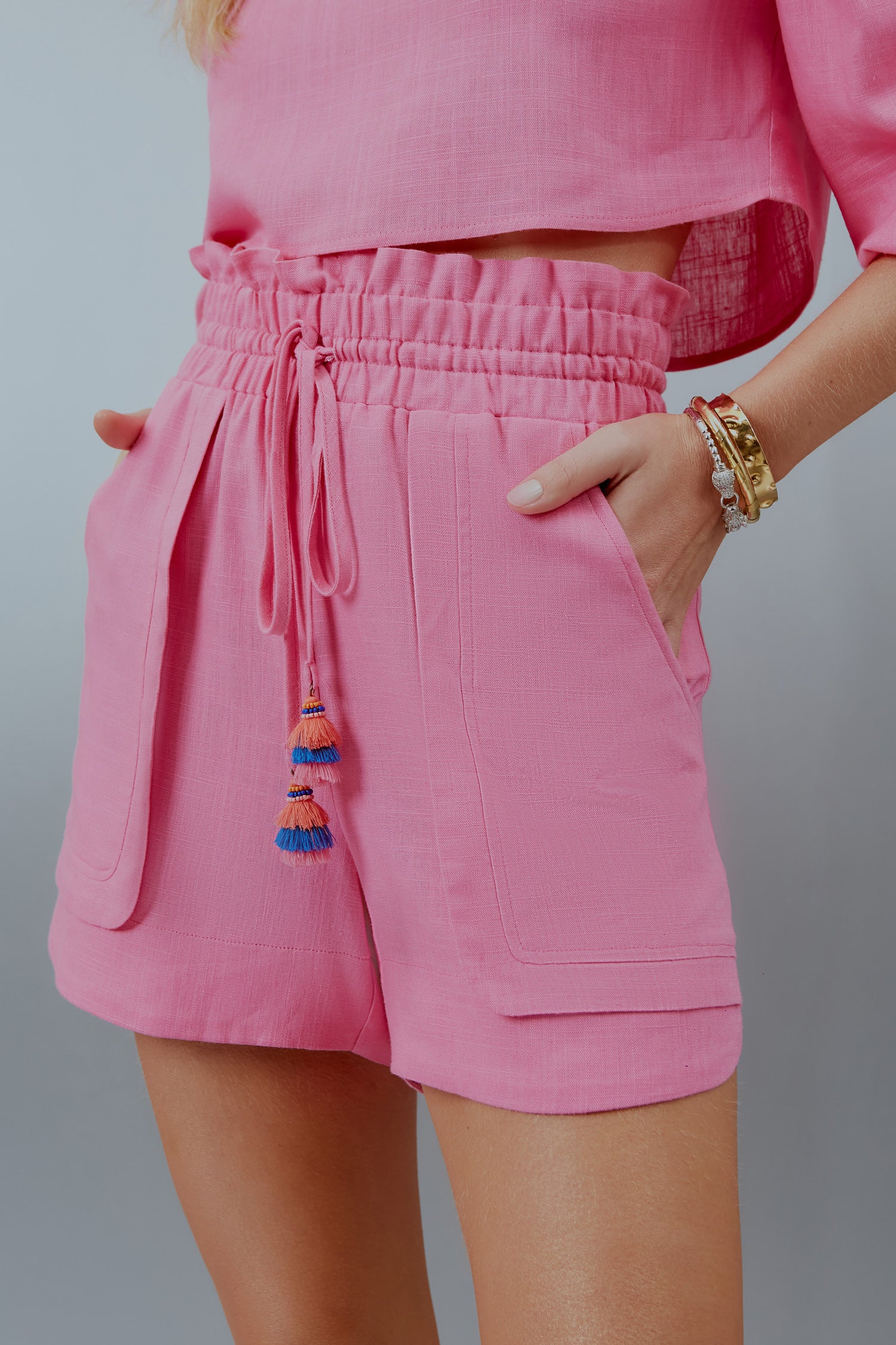 Conjunto de short e blusa de manga curta, com shape soltinho e cintura alta. Bolso com sobreposição e acabamento de tassel tricolor. Blusa cropped e manga balonê. Tecido misto de linho, muito leve e delicado.