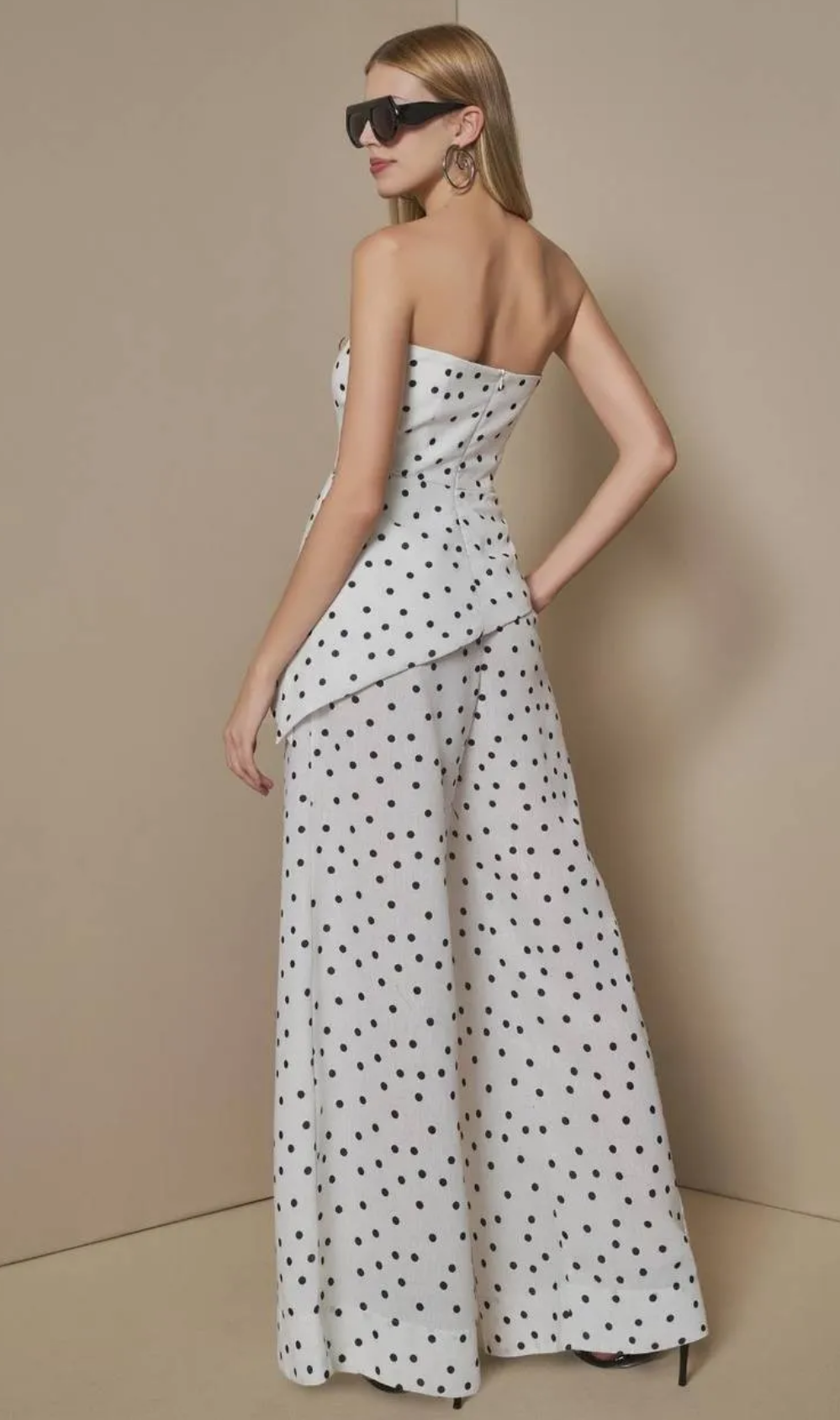 O Off White realça a delicadeza artística desse conjunto estampado, trazendo modernidade com um toque de poesia. O top estruturado com barbatanas no busto, costas e laterais modela a silhueta com precisão, enquanto o peplum assimétrico adiciona movimento e um charme inesperado, reforçado pela fenda lateral que traz leveza ao visual. A calça completa o conjunto com elegância, graças à modelagem impecável, ao bolso faca frontal e ao caimento que alonga a linha das pernas. O resultado é um look sofisticado, equilibrado e marcante, perfeito para quem busca presença com suavidade.