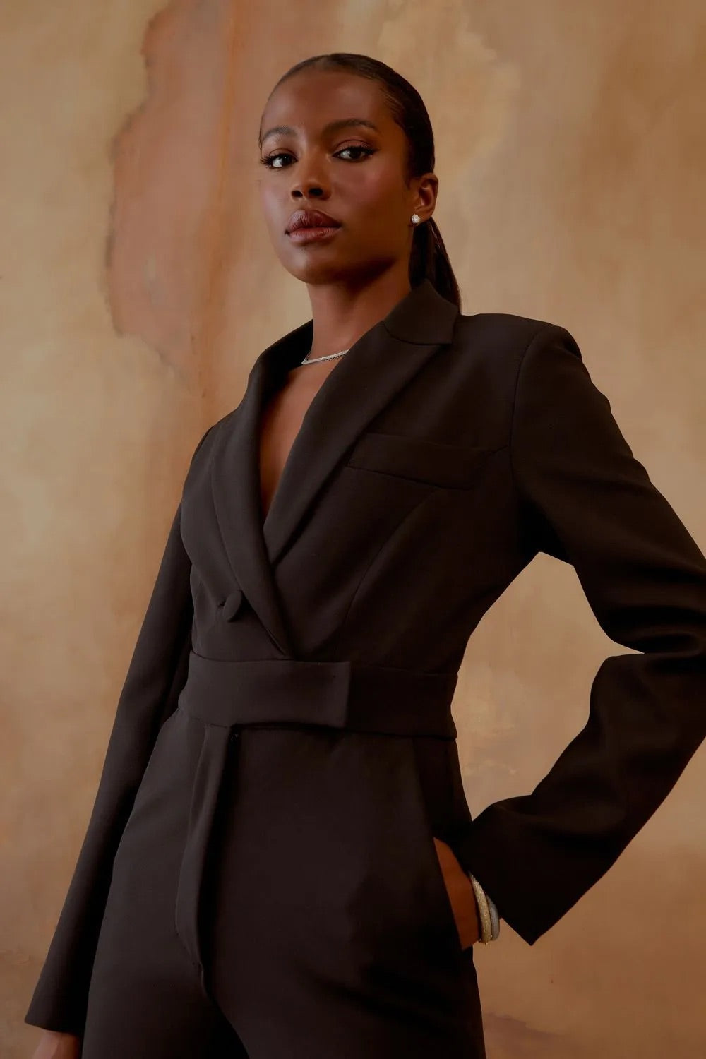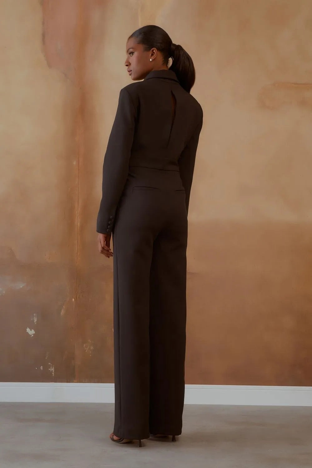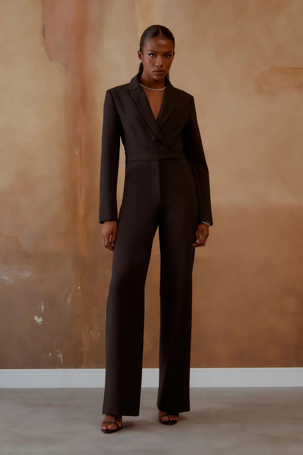 Descubra a elegância contemporânea com o macacão alfaiataria preto em crepe com elastano.