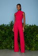 Macacão vermelho confeccionado em crepe estruturado, com modelagem acinturada que valoriza a silhueta. A peça apresenta gola alta, recorte sem mangas e calça reta, finalizada com faixa para amarração na cintura.