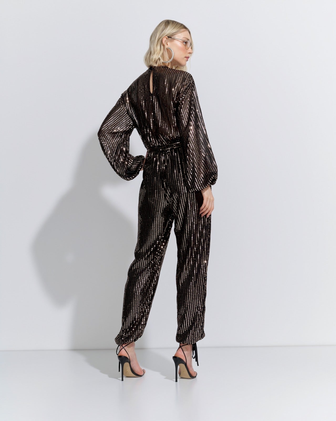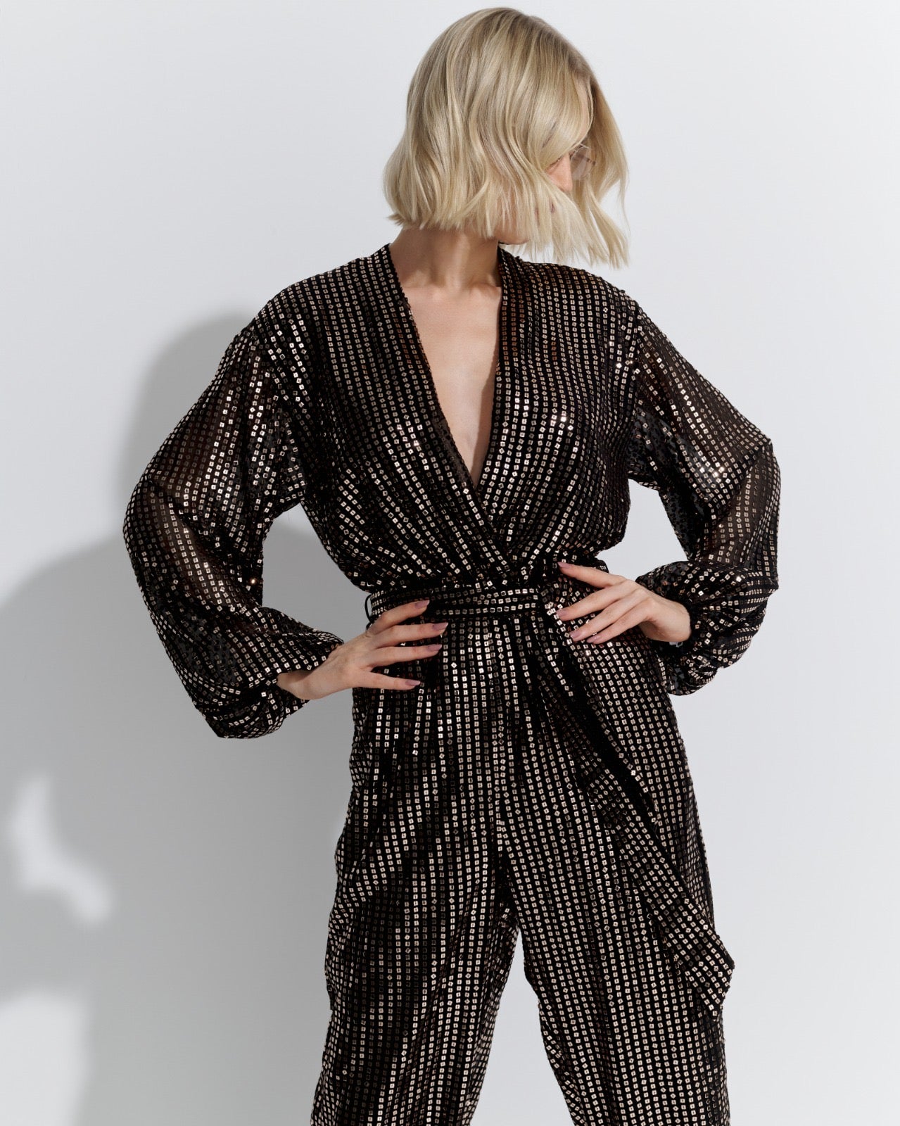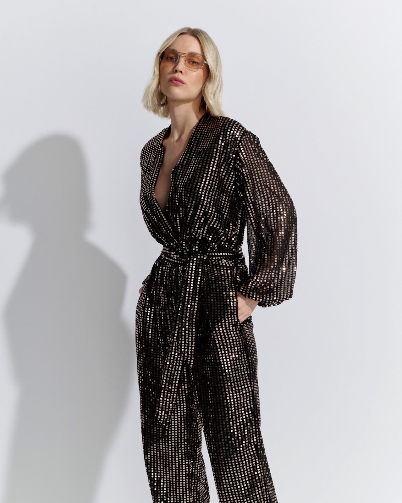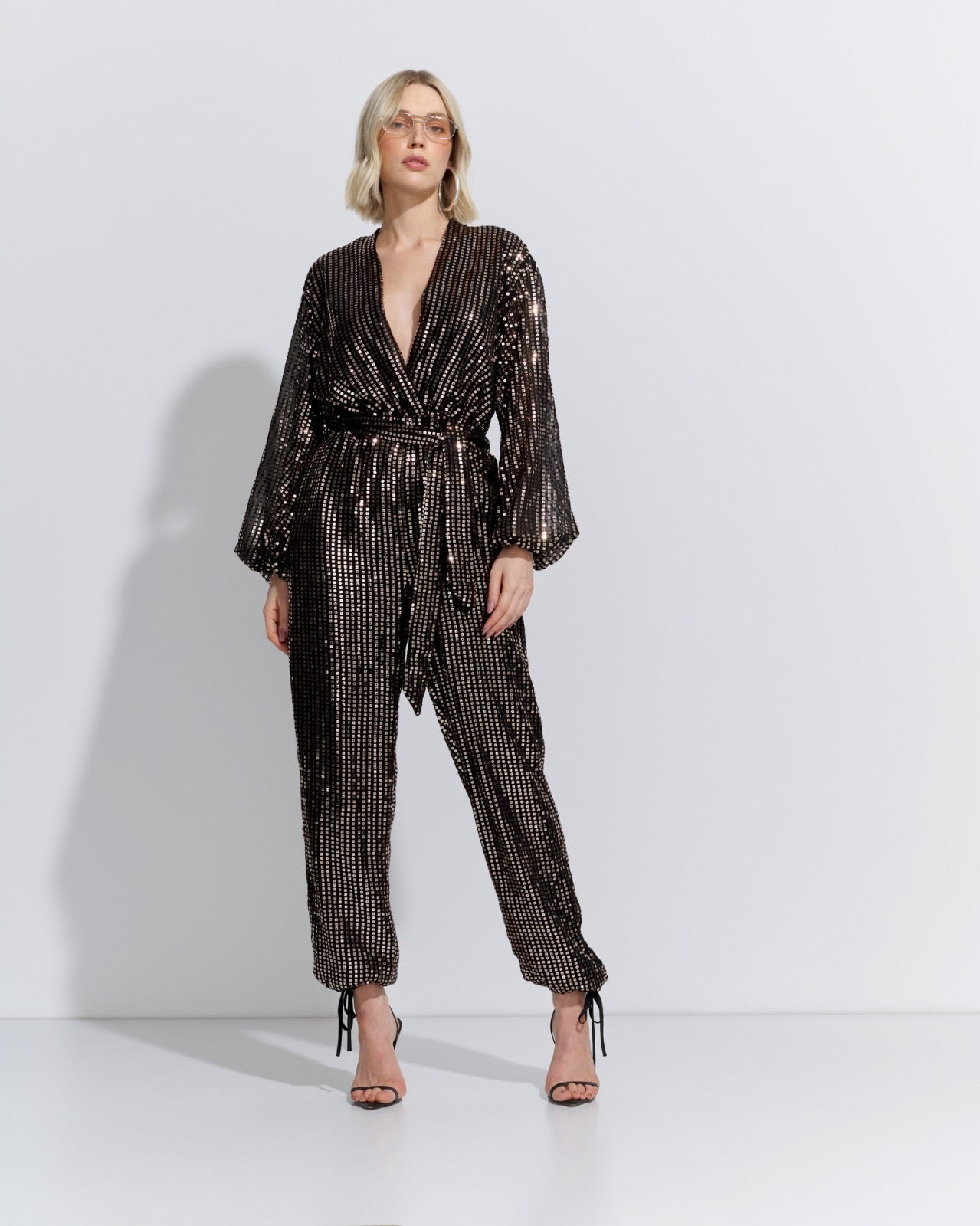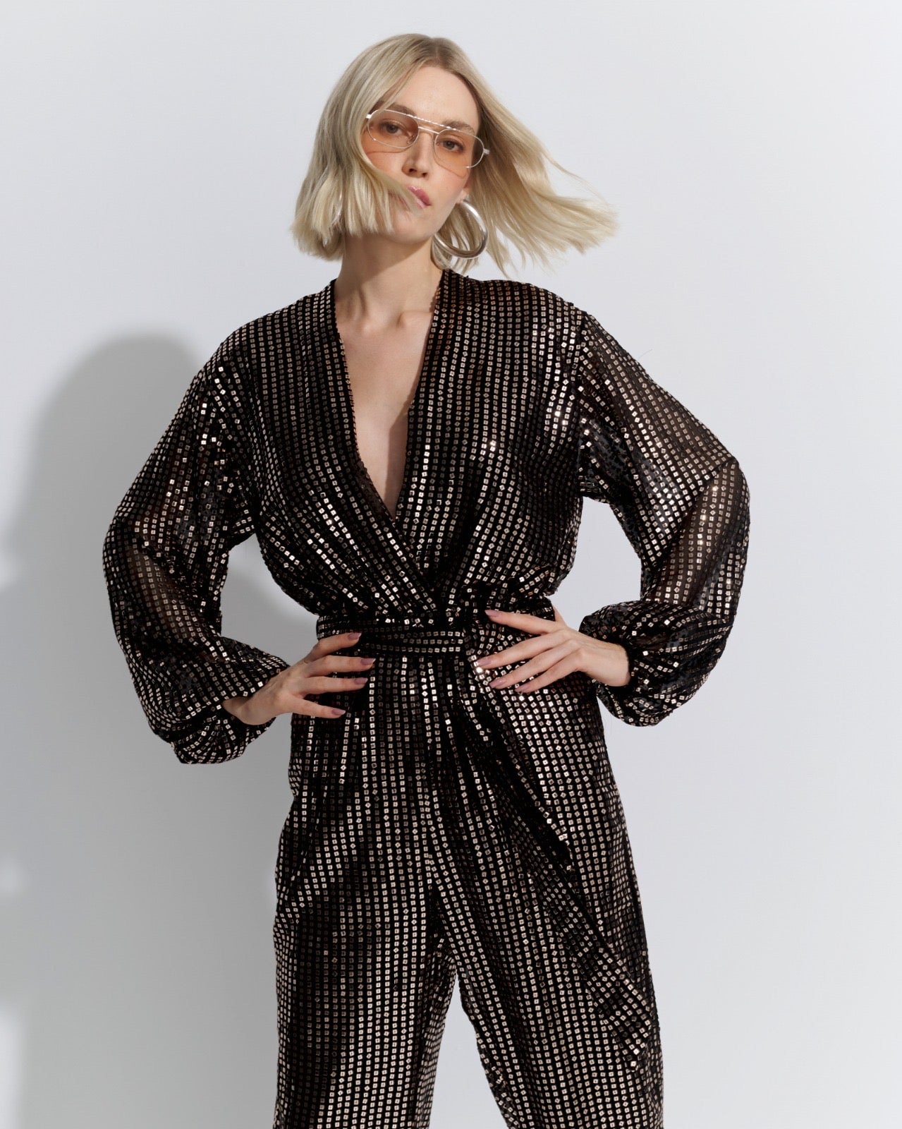 Em versão no preto, o macacão paetizado ganha ar poderoso. O brilho dos paetês em contraste com o fundo escuro potencializa o efeito glamouroso da peça. A silhueta trespassada, mangas volumosas e faixa na cintura criam um visual impactante e sofisticado. Perfeito para festas, jantares e eventos especiais onde o destaque é garantido.