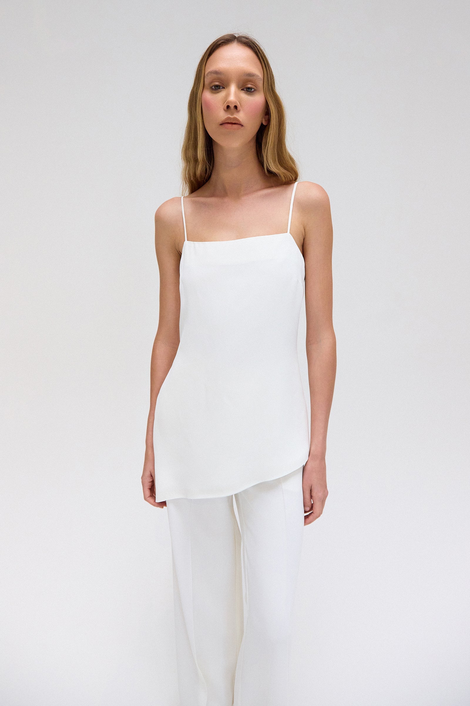 Blusa em tecido encorpado com toque de crepe. Modelagem ampla e shape soltinho. Possui decote reto e alças finas reguláveis. Detalhe de barra assimétrica. Fechamento por zíper invisível lateral.