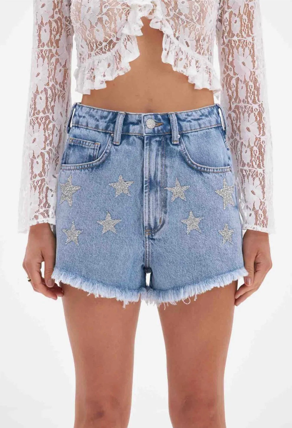 Esse short jeans conta com uma cintura alta, modelagem confortável, bolsos laterais, aplicações de brilhos no formato de estrelas e bainha desfiada. De looks casuais à looks ousados, esse short vai te acompanhar com muito estilo e glamour.