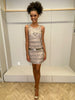 Vestido curto feito para estilista americana Adrianna Papell, que oferece em suas coleções de prêt-à-porter os clássicos para um closet. Com mais de três décadas no ramo da moda, Adrianna Papell sabe fazer vestidos lisonjeiros que são únicas e femininas. Este vestido é todo rebordado em tule, com detalhes em prateado e grafite. O forro possui um tom nude, muito feminino e foi confeccionado todo em elastano.