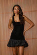 Vestido curto preto confeccionado em uma combinação de veludo e tricoline. Possui decotes em U, alças largas, sem mangas, cintura baixa e saia balonê. Fechamento posterior por zíper.