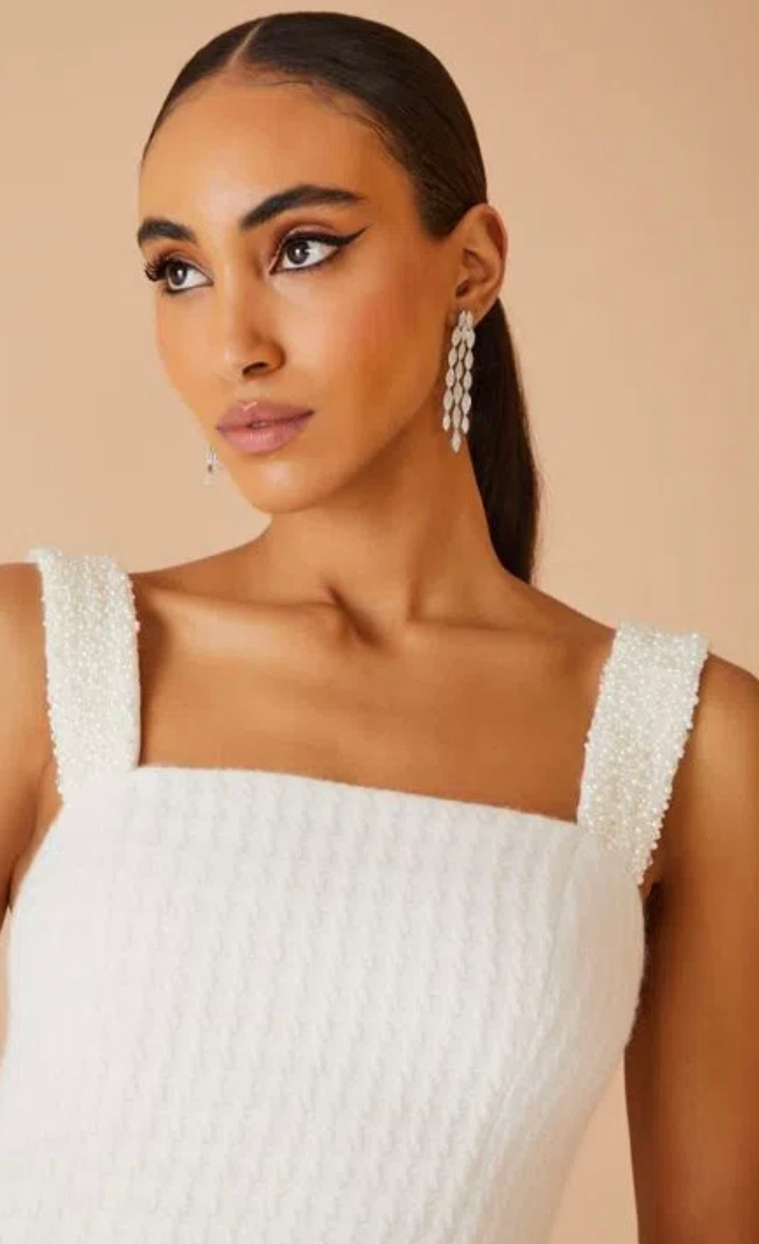 A lã texturizada confere uma aparência luxuosa e de qualidade ao vestido, enquanto as alças largas com bordados de pérolas e cristais adicionam um toque de glamour e refinamento ao visual.