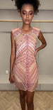Vestido curto rebordado em tule, sem mangas. Confeccionado com pedrarias finas em tons pastéis, este vestido é uma obra de arte. O decote arredondado torna-o ainda mais elegante.