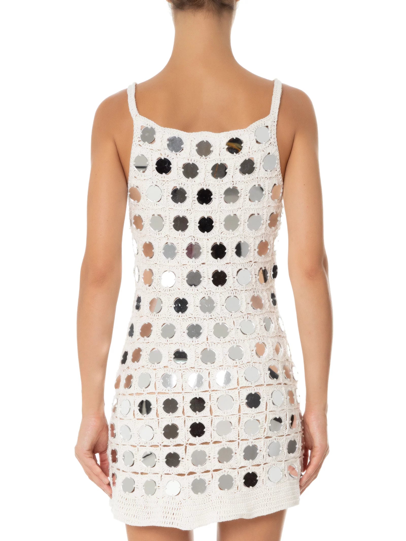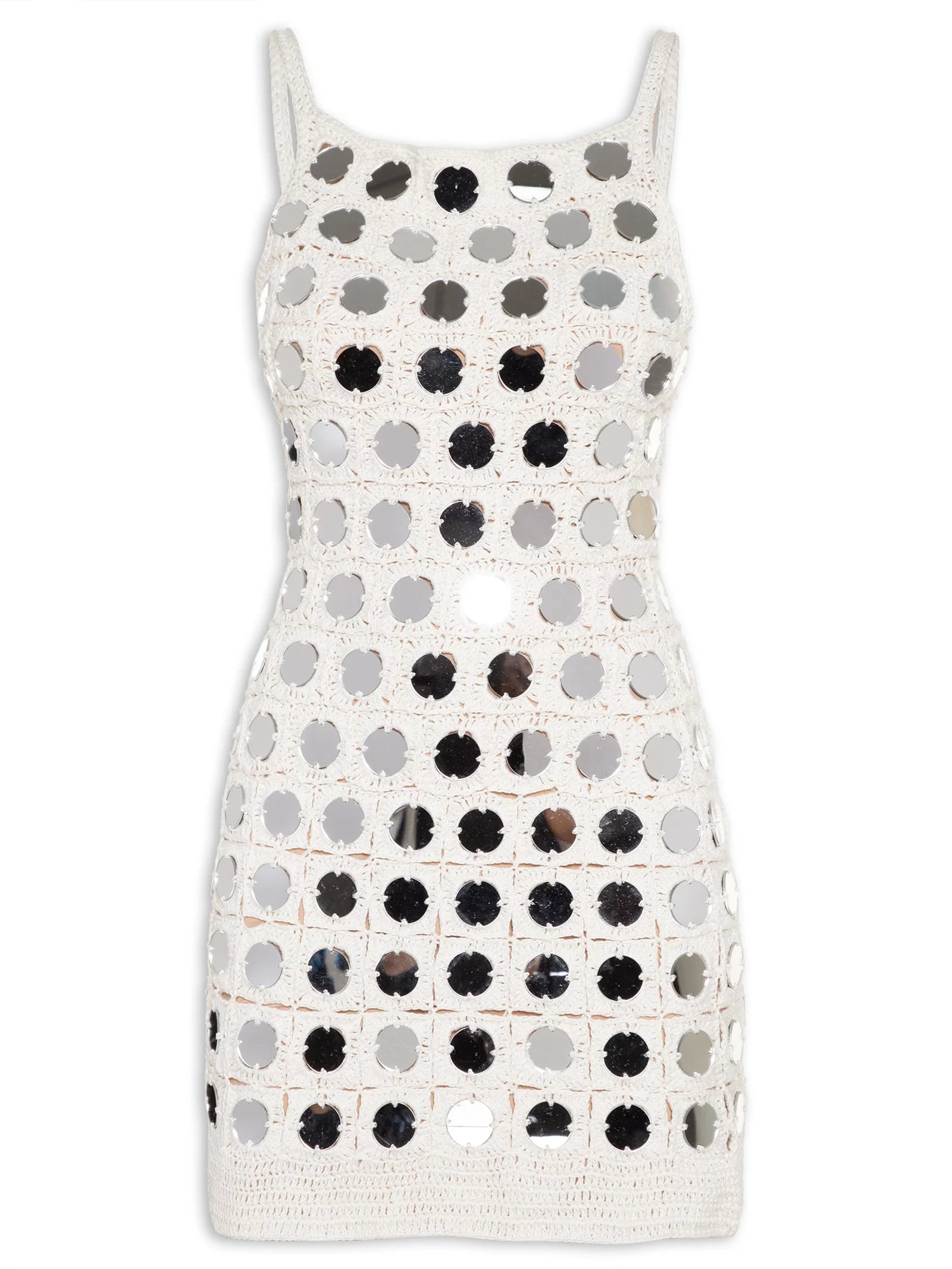 O vestido Off White é confeccionado em crochê com baixa Elasticidade. A Peça Justa Ao Corpo Possui Decote Reto, Alças Finas, Cavas Estendidas, Bordado De Ornamentos Redondos Com Superfície Em Espelho, Comprimento Curto, Forro E Não Possui Fechamento.