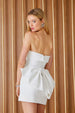 Vestido curto off white, tomara que caia. Acinturado e confeccionado em tecido de crepe. Com detalhe do laço nas costas, que pode ser removível, este vestido oferece um caimento impecável que valoriza a silhueta. Possui fechamento posterior por zíper de nylon.