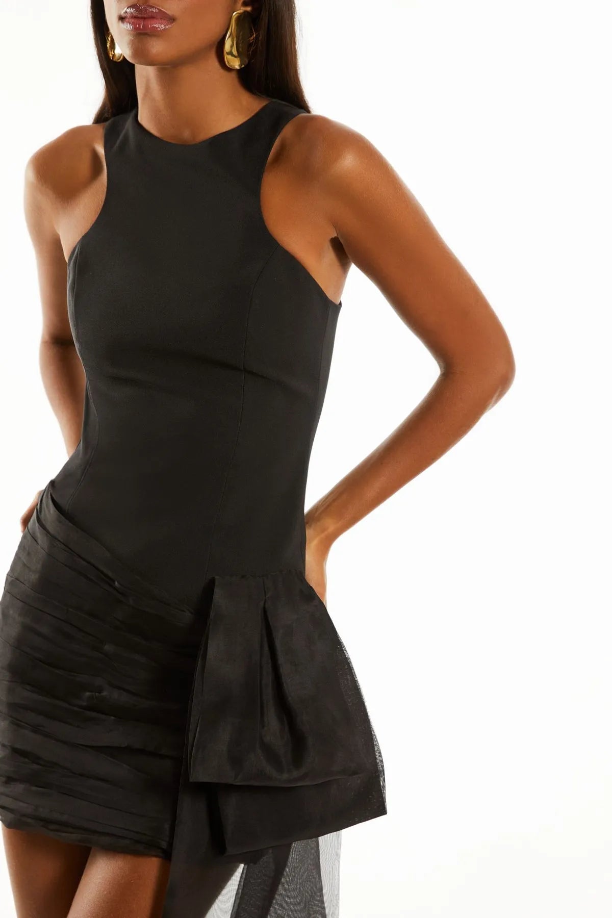 Vestido curto preto confeccionado em tecido de crepe estruturado detalhado em organza. Possui gola careca, sem mangas, saia drapeada e laço aplicado na lateral como detalhe. Fechamento posterior por zíper.