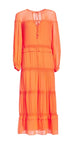 Vestido em camadas, em tule. No comprimento maxi midi, e detalhes em lastex ao longo do caimento, o vestido combina muito com dias quentes e praia, apesar das mangas longas.