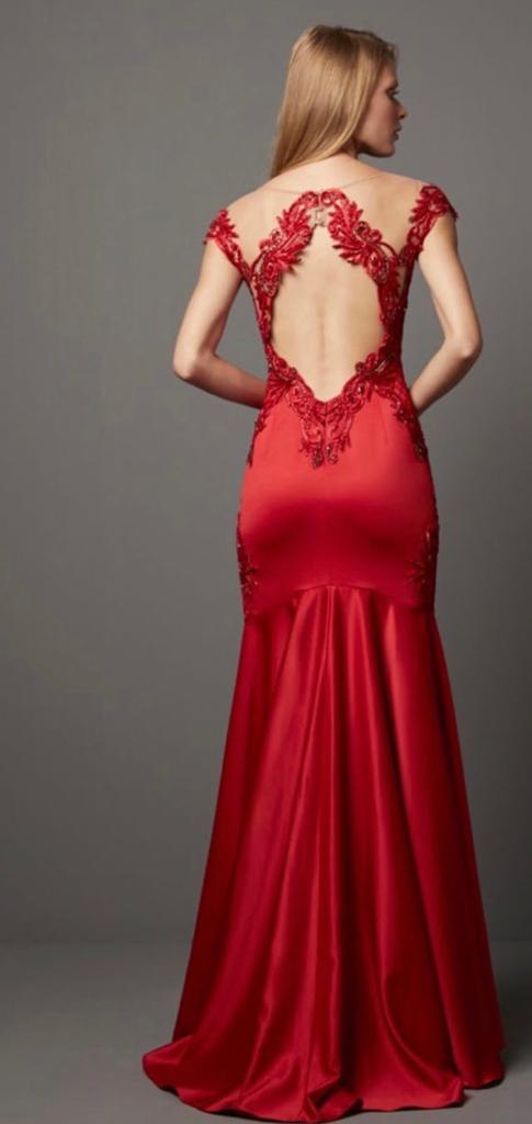 O vestido no formato sereia, com decotes e bordado é sinônimo de feminilidade e elegância. O bordado com fina pedraria trazem um efeito em 3D e formam um desenho incrível. O decote na frente possui uma camada de tule com transparência, que se estende até parte das costas. Um recorte charmoso deixa parte das costas à mostra. E a silhueta se destaca pelo contorno que a peça faz ao corpo. Possui bojo para sustentação.