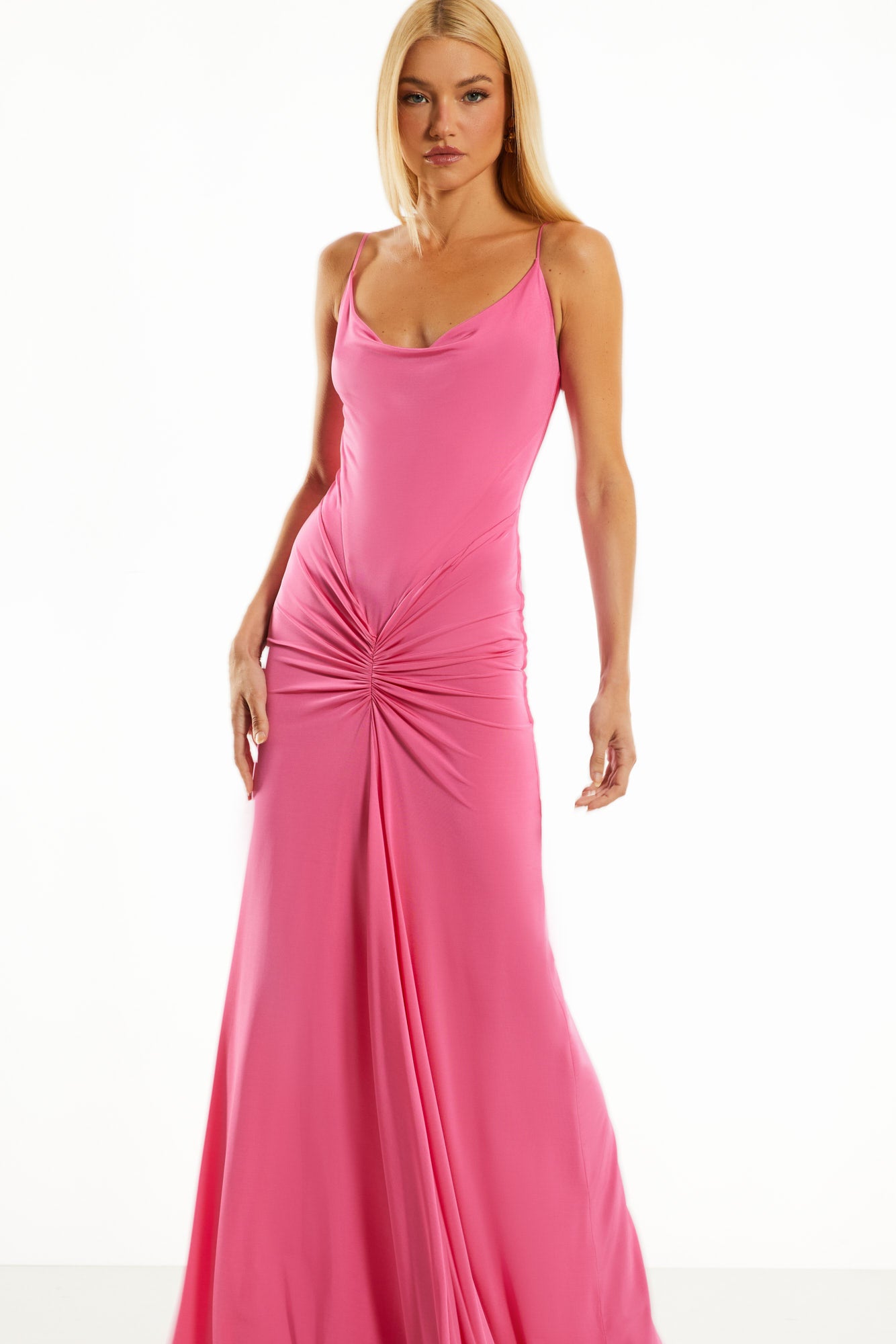 Vestido longo rosa confeccionado em Jersey. Possui decote degagê, alças finas, franzidos localizados na parte central da peça e nas costas. Fechamento posterior por zíper.
