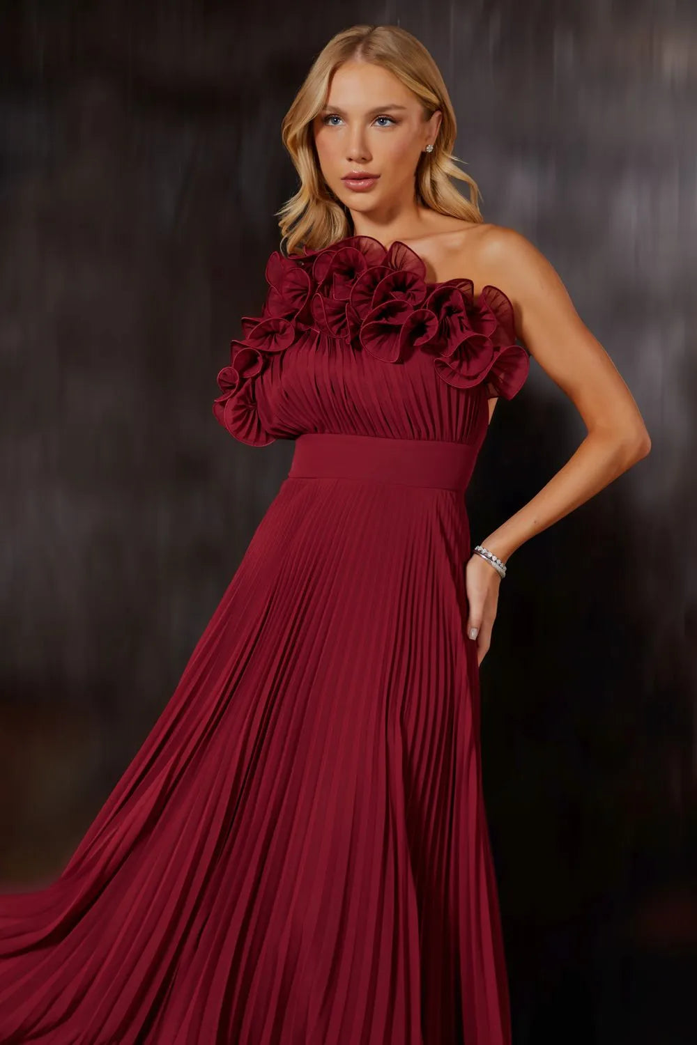 Vestido longo bordô plissado confeccionado em tecido leve. Possui modelagem um ombro só, babados plissados e bainha com nylon e fechamento posterior por zíper.