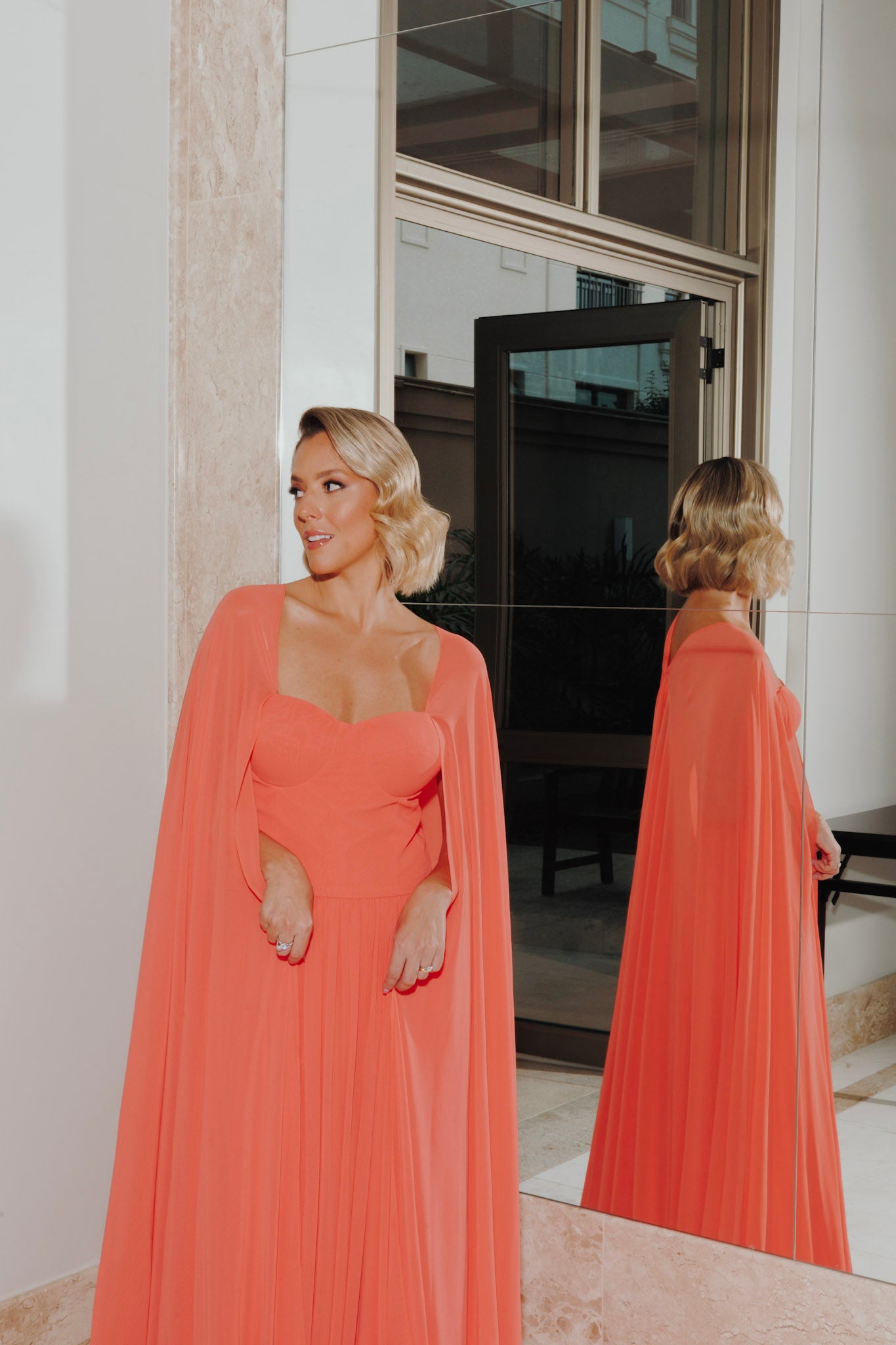 Vestido confeccionado em tecido chiffon saab. Modelo possui bojo, mangas longas fluídas e zíper invisível fecho costas com colchete. // Composição: 100%Poliéster - Forro 97%Poliéster 03%Elastano // Características do tecido: Toque macio, fluidez e excelente caimento. // Vantagens: Maleável, durável e confortável. // Ideal para casamentos e formaturas. // A tonalidade das cores pode variar de acordo com seu aparelho de celular ou tela do monitor. Os