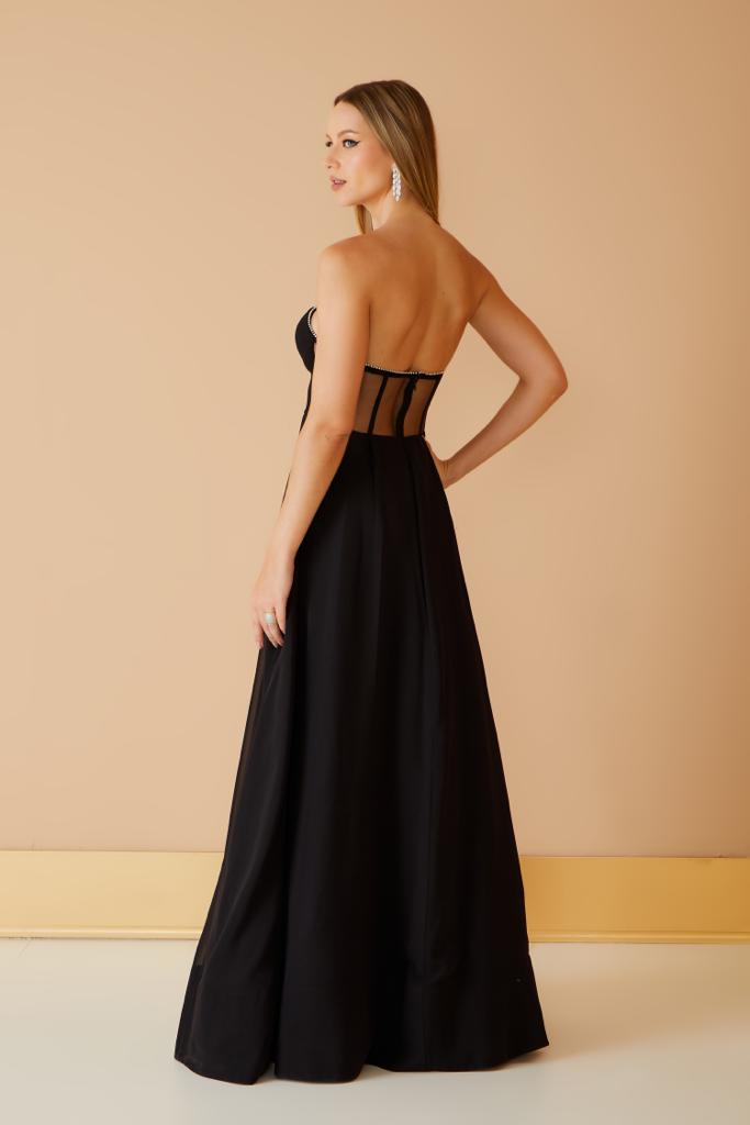 Vestido longo preto em tecido fluido, com transparência. Blusa ajustada, com decote profundo e aplicação com strass e saia com shape amplo. A peça acompanha faixa que pode ser usada como echarpe ou na cintura. Um modelo para deixar você charmosa e super elegante. O vestido preto de festa é uma peça atemporal que nunca sai de moda. O Preto é uma cor que transmite elegância e sofisticação. Por isso, o vestido preto de festa é uma ótima escolha para eventos mais formais, como casamentos, formaturas e jantares de gala. Além disso, o vestido preto é uma peça fácil de combinar com diferentes acessórios como sapatos, bolsas e jóias. Isso significa que você pode criar diversos looks diferentes com uma mesma peça.