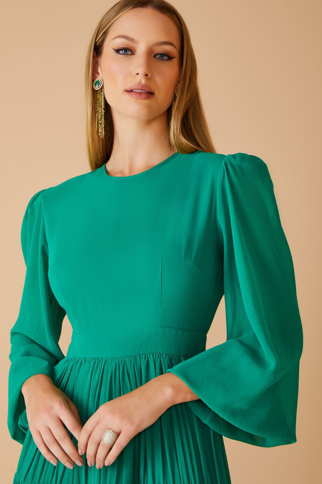 Vestido longo verde esmeralda em tecido fluido com transparência. Blusa com mangas longas e saia ampla em camadas drapeadas. O Cinto é vendido separadamente. Nesta temporada, a cor verde-esmeralda complementa a produção com um toque de classe e elegância. O vestido longo verde esmeralda em tecido fluido com transparência pode ser uma peça muito elegante e impactante. Opte por acessórios simples e minimalistas para não competir com o vestido. Um par de brincos pequenos, uma pulseira fina e um colar delicado seriam uma ótima opção. Use sapatos delicados. Sandálias de tiras podem ser uma boa opção. Scarpin também harmoniza com a peça. Escolha uma maquiagem suave e natural para equilibrar a ousadia do vestido. Um batom nude e um rímel para realçar os olhos podem ser suficientes.