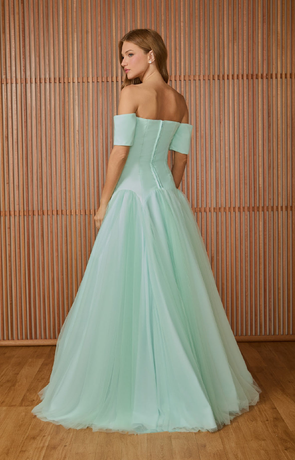Vestido longo verde menta confeccionado em tule. Com modelagem ombro a ombro e decote levemente coração, apresenta mangas curtas e cintura baixa com recortes irregulares. Fechamento posterior por zíper.
