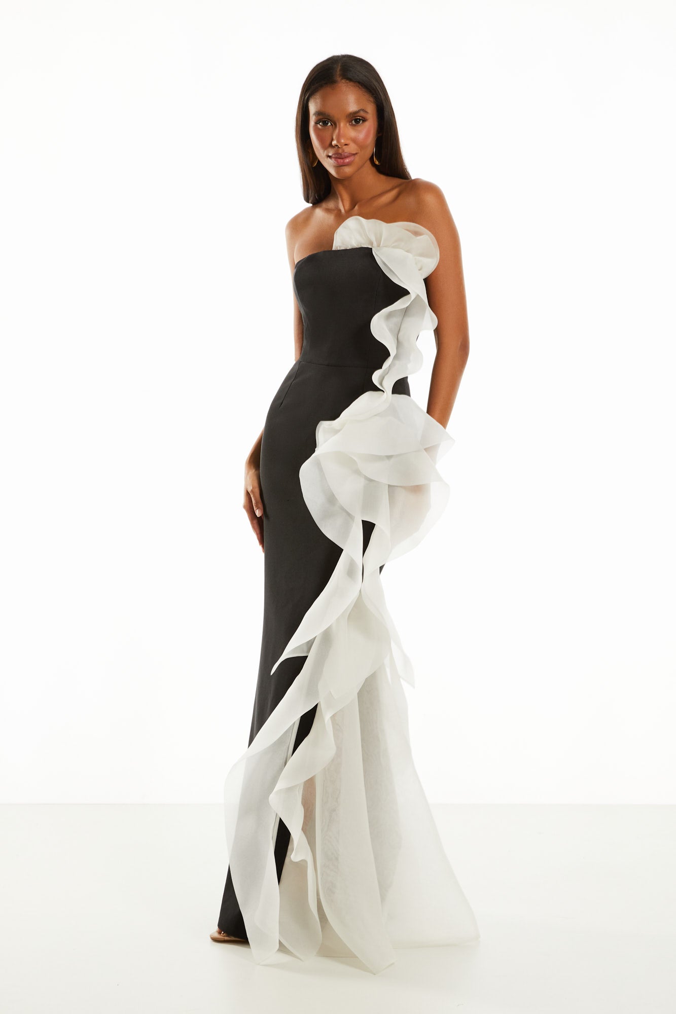 Vestido longo preto acinturado confeccionado em tecido de crepe estruturado detalhado em babado de organza de seda pura off white. Possui modelagem tomara que caia, decote reto e fechamento posterior por zíper.