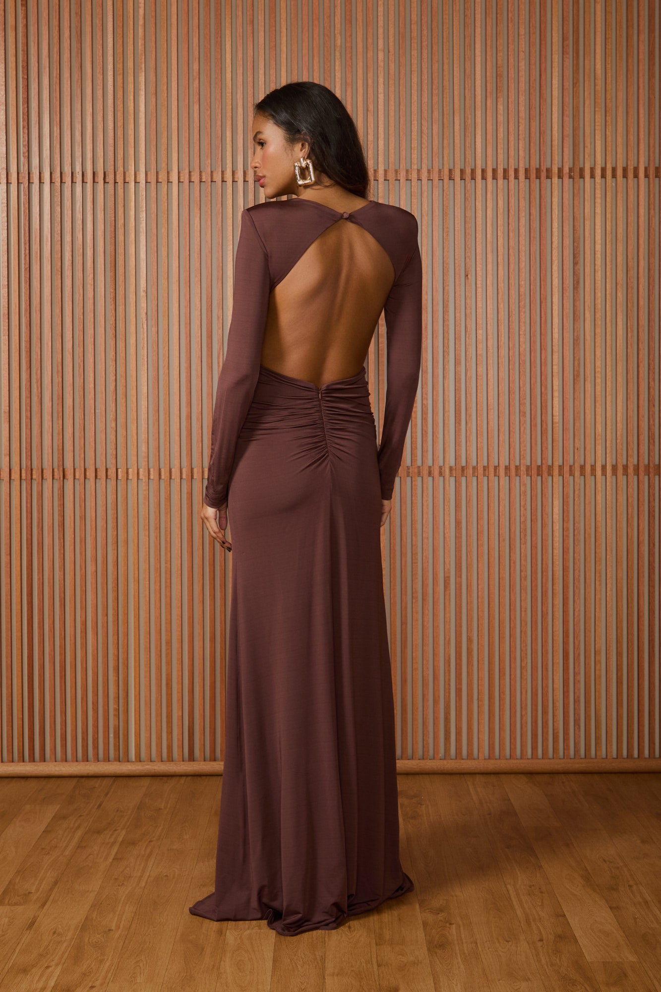 Confeccionado em tecido leve com alta elasticidade. A peça justa ao corpo possui decote canoa, mangas longas, abertura posterior com detalhe vazado com fechamento por botão, recorte frontal com detalhe de franzido e aviamento metalizado aplicado, forro, ombreiras, recortes frontais e posteriores e fechamento posterior por zíper.